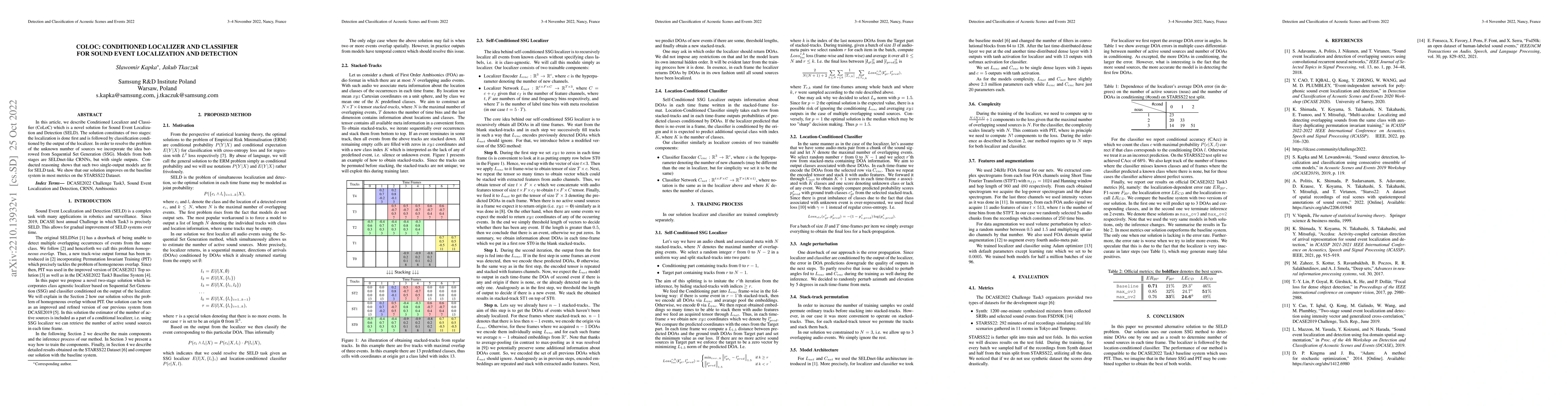 In this article, we describe Conditioned Localizer and Classifier (CoLoC) which is a novel solution for Sound Event Localization and Detection (SELD). The solution constitutes of two stages: the localization is done first and is followed by classification conditioned by the output of the localizer. In order to resolve the problem of the unknown number of sources we incorporate the idea borrowed from Sequential Set Generation (SSG). Models from both stages are SELDnet-like CRNNs, but with single outputs. Conducted reasoning shows that such two single-output models are fit for SELD task. We show that our solution improves on the baseline system in most metrics on the STARSS22 Dataset.