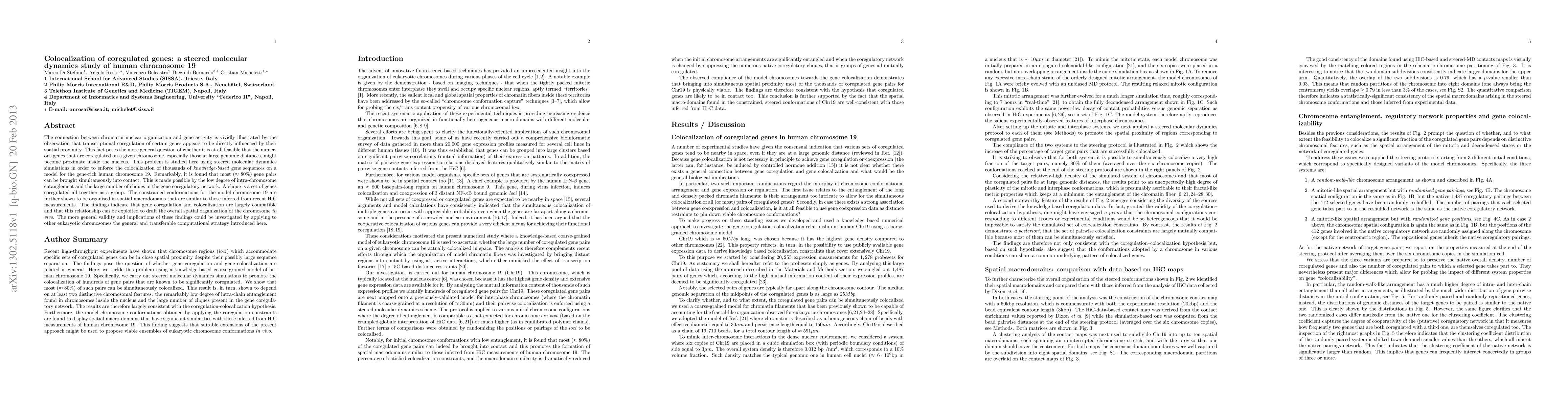 This study uses steered molecular dynamics simulations to explore the spatial proximity of coregulated genes on human chromosome 19, finding that ~80% of gene pairs can be colocalized due to low intra-chromosome entanglement and extensive gene coregulatory networks. The results suggest that gene coregulation and colocalization are compatible and can guide chromosome spatial organization in vivo.