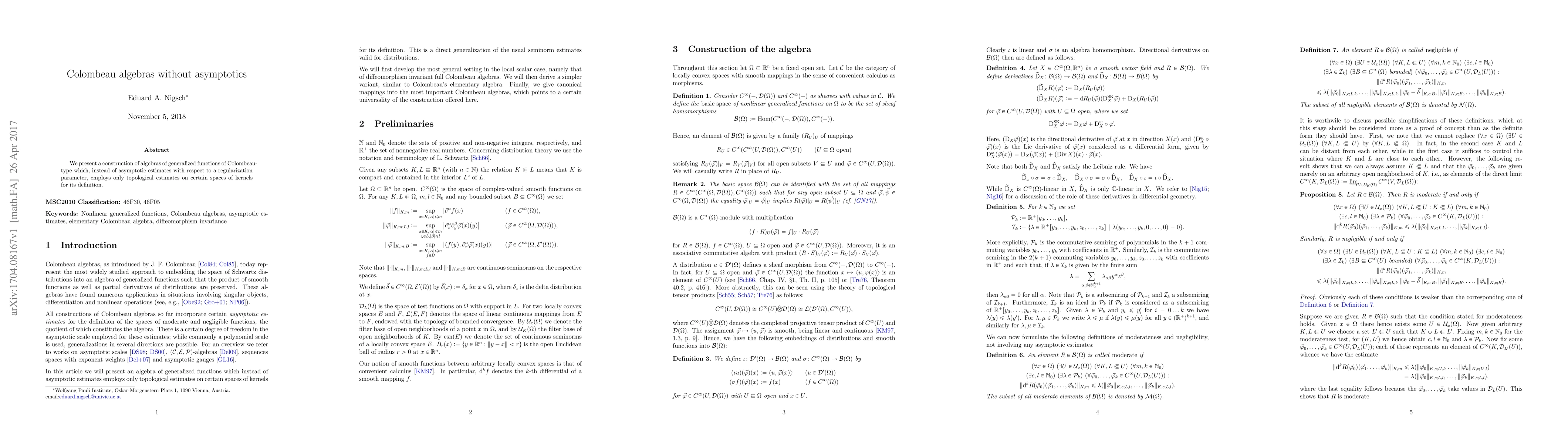 Summary: This paper introduces Colombeau-type algebras of generalized functions that define their structure using topological estimates on kernel spaces, rather than relying on asymptotic estimates relative to a regularization parameter.