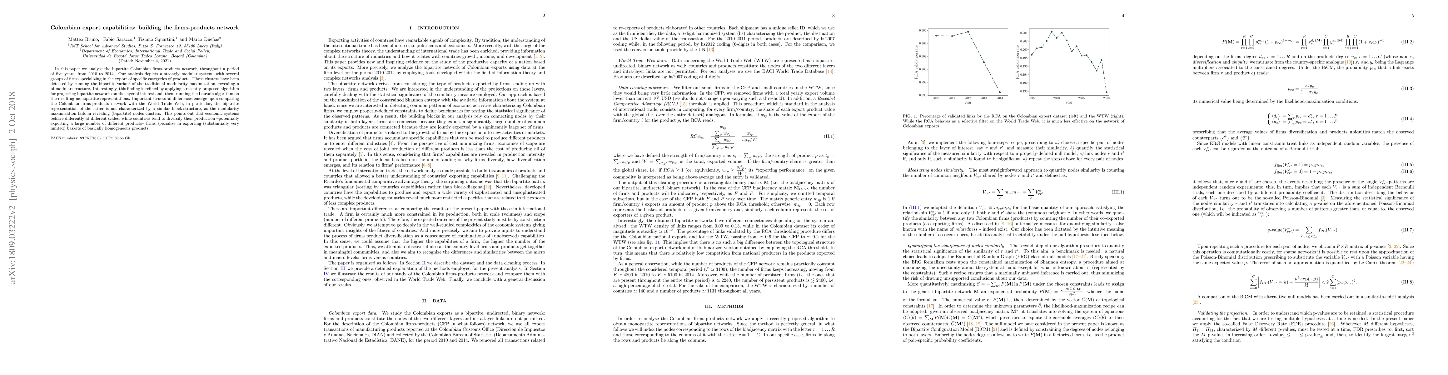 In this paper we analyse the bipartite Colombian firms-products network, throughout a period of five years, from 2010 to 2014. Our analysis depicts a strongly modular system, with several groups of firms specializing in the export of specific categories of products. These clusters have been detected by running the bipartite variant of the traditional modularity maximization, revealing a bi-modular structure. Interestingly, this finding is refined by applying a recently-proposed algorithm for projecting bipartite networks on the layer of interest and, then, running the Louvain algorithm on the resulting monopartite representations. Important structural differences emerge upon comparing the Colombian firms-products network with the World Trade Web, in particular, the bipartite representation of the latter is not characterized by a similar block-structure, as the modularity maximization fails in revealing (bipartite) nodes clusters. This points out that economic systems behave differently at different scales: while countries tend to diversify their production --potentially exporting a large number of different products-- firms specialize in exporting (substantially very limited) baskets of basically homogeneous products.