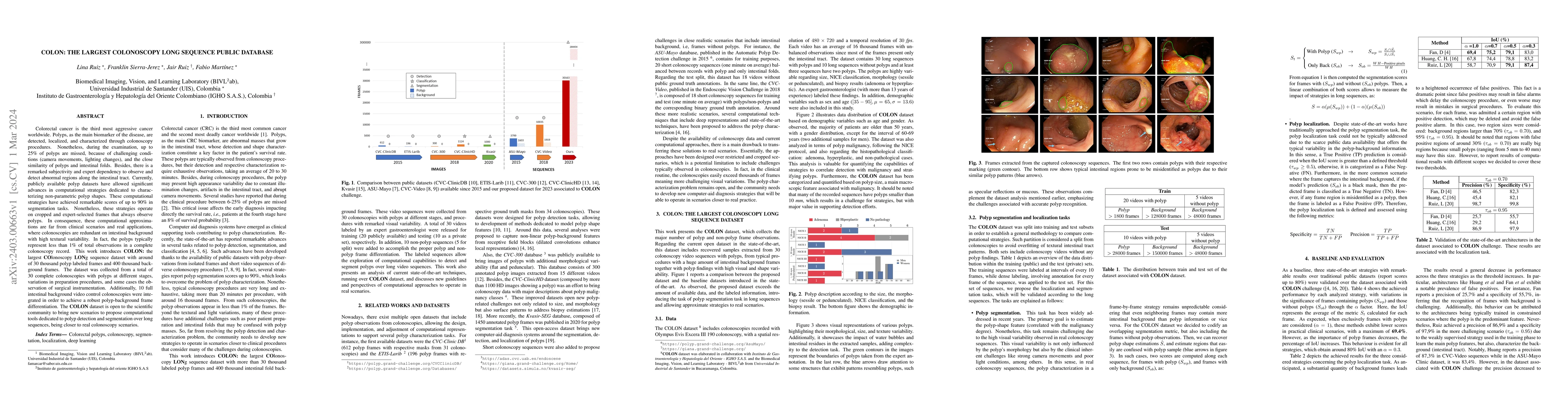 The COLON dataset is the largest public colonoscopy long sequence database, containing around 30,000 labeled polyp frames and 400,000 background frames from 30 complete colonoscopies, aimed at advancing computational methods for polyp detection and segmentation in realistic clinical scenarios. It includes variations in preparation and surgical observations, along with 10 control videos to enhance background differentiation.