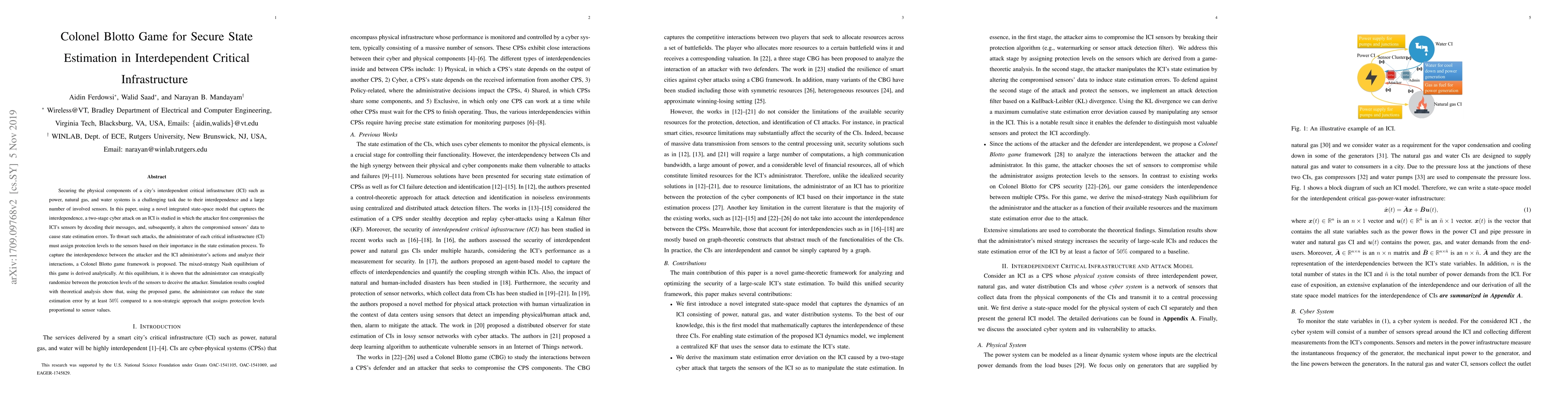 This paper proposes a Colonel Blotto game framework to secure interdependent critical infrastructures against cyber attacks. It demonstrates that strategic randomization of sensor protection levels can reduce state estimation errors by at least 50% compared to non-strategic approaches.