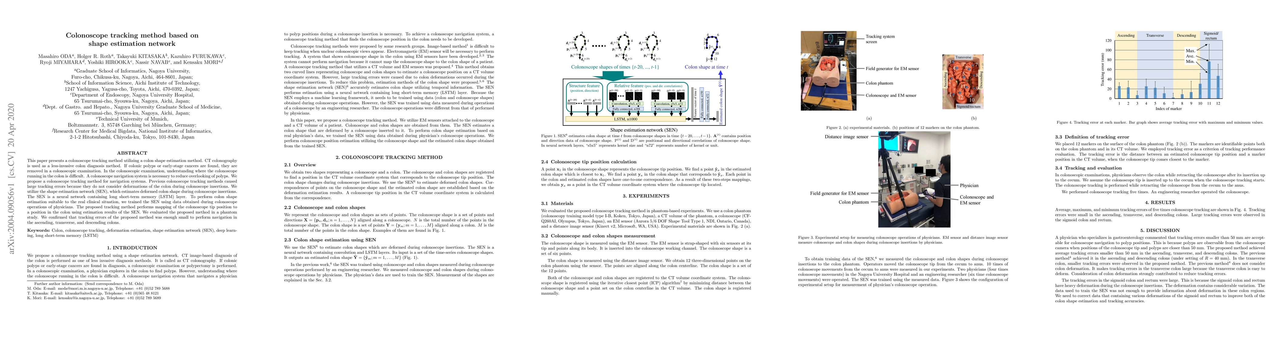 This paper presents a colonoscope tracking method utilizing a colon shape estimation method. CT colonography is used as a less-invasive colon diagnosis method. If colonic polyps or early-stage cancers are found, they are removed in a colonoscopic examination. In the colonoscopic examination, understanding where the colonoscope running in the colon is difficult. A colonoscope navigation system is necessary to reduce overlooking of polyps. We propose a colonoscope tracking method for navigation systems. Previous colonoscope tracking methods caused large tracking errors because they do not consider deformations of the colon during colonoscope insertions. We utilize the shape estimation network (SEN), which estimates deformed colon shape during colonoscope insertions. The SEN is a neural network containing long short-term memory (LSTM) layer. To perform colon shape estimation suitable to the real clinical situation, we trained the SEN using data obtained during colonoscope operations of physicians. The proposed tracking method performs mapping of the colonoscope tip position to a position in the colon using estimation results of the SEN. We evaluated the proposed method in a phantom study. We confirmed that tracking errors of the proposed method was enough small to perform navigation in the ascending, transverse, and descending colons.