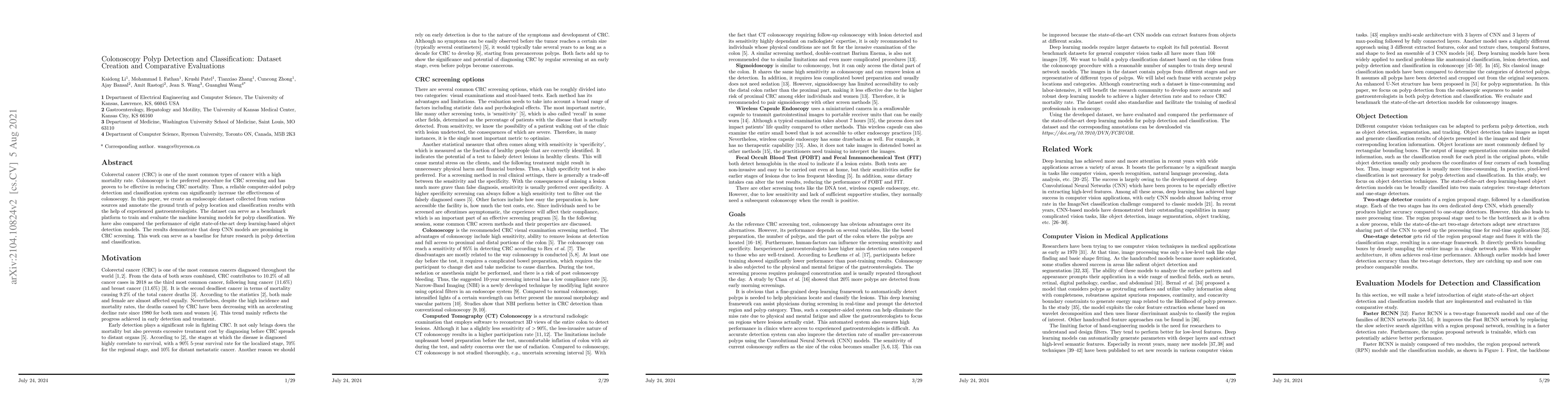 Colorectal cancer (CRC) is one of the most common types of cancer with a high mortality rate. Colonoscopy is the preferred procedure for CRC screening and has proven to be effective in reducing CRC mortality. Thus, a reliable computer-aided polyp detection and classification system can significantly increase the effectiveness of colonoscopy. In this paper, we create an endoscopic dataset collected from various sources and annotate the ground truth of polyp location and classification results with the help of experienced gastroenterologists. The dataset can serve as a benchmark platform to train and evaluate the machine learning models for polyp classification. We have also compared the performance of eight state-of-the-art deep learning-based object detection models. The results demonstrate that deep CNN models are promising in CRC screening. This work can serve as a baseline for future research in polyp detection and classification.