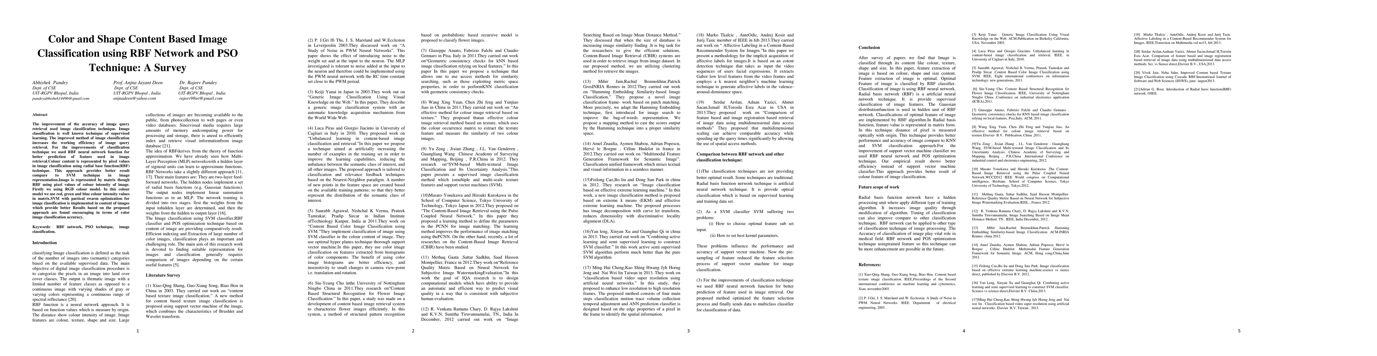 This research paper proposes a color-based image classification method using RBF networks and PSO technique, achieving better accuracy compared to traditional SVM methods.