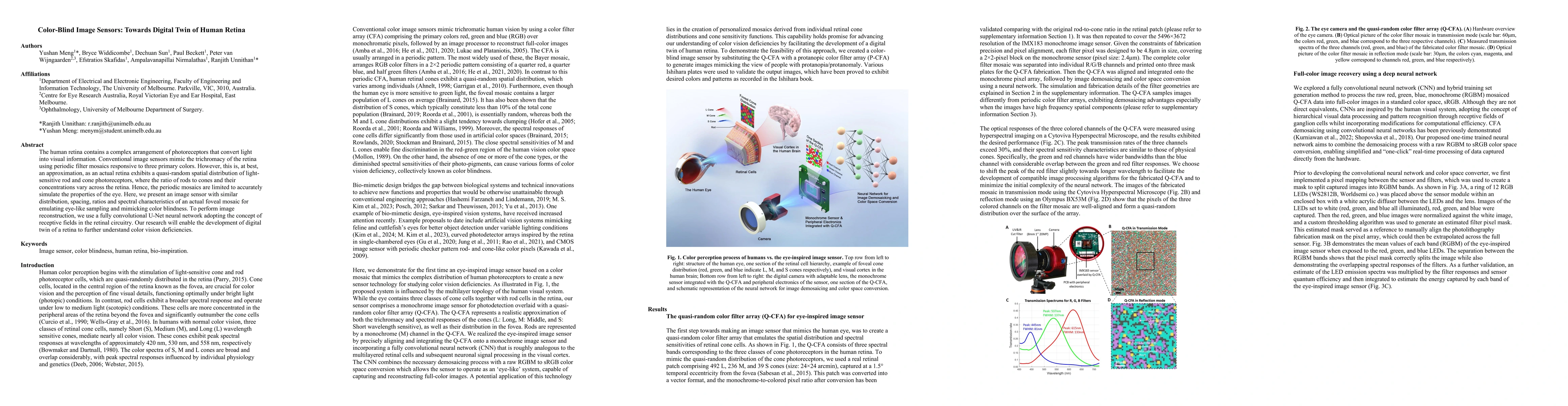 The human retina contains a complex arrangement of photoreceptors that convert light into visual information. Conventional image sensors mimic the trichromacy of the retina using periodic filter mosaics responsive to three primary colors. However, this is, at best, an approximation, as an actual retina exhibits a quasi-random spatial distribution of light-sensitive rod and cone photoreceptors, where the ratio of rods to cones and their concentrations vary across the retina. Hence, the periodic mosaics are limited to accurately simulate the properties of the eye. Here, we present an image sensor with similar distribution, spacing, ratios and spectral characteristics of an actual foveal mosaic for emulating eye-like sampling and mimicking color blindness. To perform image reconstruction, we use a fully convolutional U-Net neural network adopting the concept of receptive fields in the retinal circuitry. Our research will enable the development of digital twin of a retina to further understand color vision deficiencies.