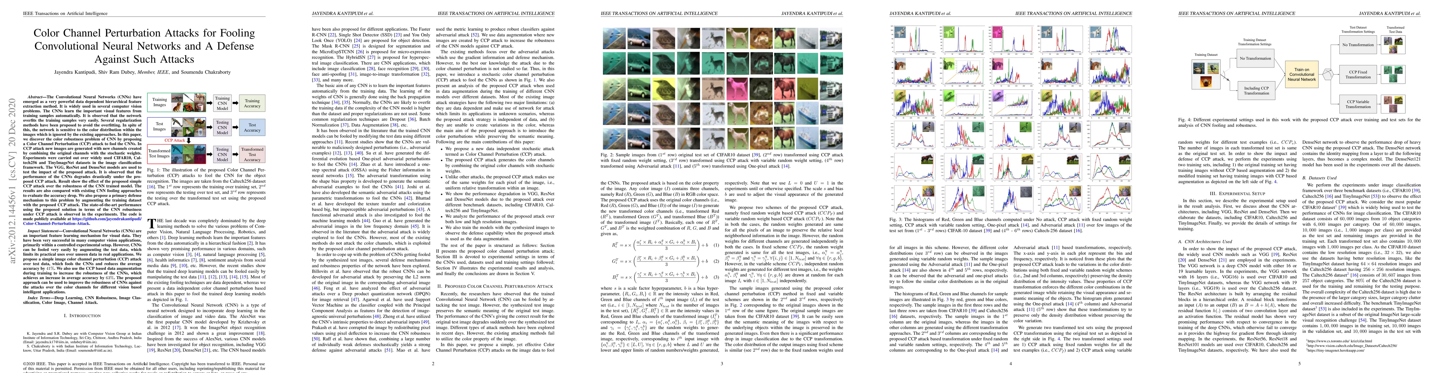 This paper introduces a Color Channel Perturbation (CCP) attack to demonstrate the vulnerability of Convolutional Neural Networks (CNNs) to color distribution changes, showing significant performance degradation across various models and datasets. It also proposes a defense mechanism by augmenting the training dataset with CCP-attacked images, achieving state-of-the-art robustness against the attack.