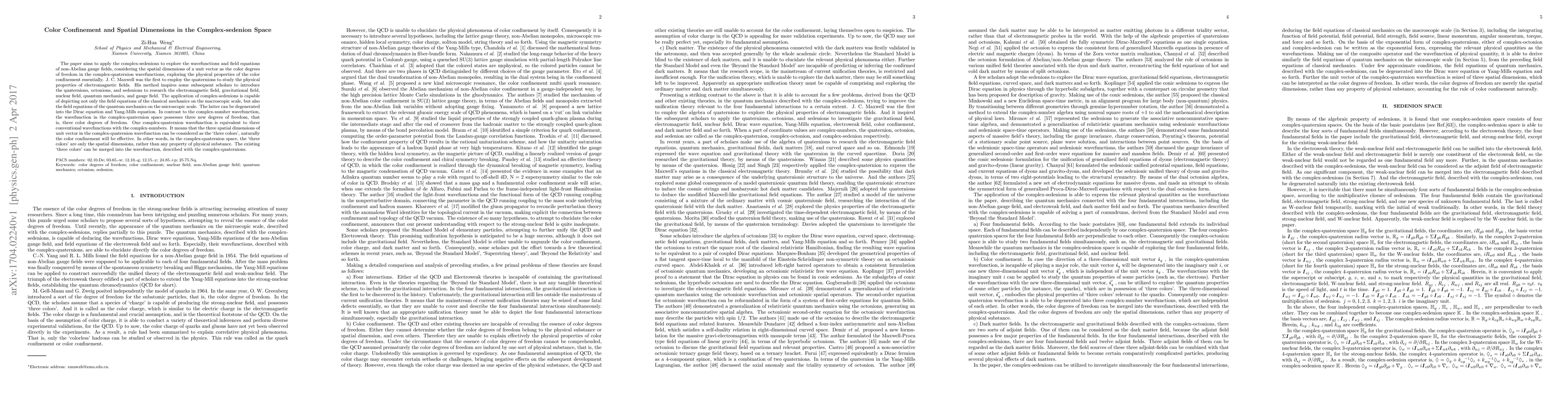 The paper aims to apply the complex-sedenions to explore the wavefunctions and field equations of non-Abelian gauge fields, considering the spatial dimensions of a unit vector as the color degrees of freedom in the complex-quaternion wavefunctions, exploring the physical properties of the color confinement essentially. J. C. Maxwell was the first to employ the quaternions to study the physical properties of electromagnetic fields. His method inspires some subsequent scholars to introduce the quaternions, octonions, and sedenions to research the electromagnetic field, gravitational field, nuclear field, quantum mechanics, and gauge field. The application of complex-sedenions is capable of depicting not only the field equations of the classical mechanics on the macroscopic scale, but also the field equations of the quantum mechanics on the microscopic scale. The latter can be degenerated into the Dirac equation and Yang-Mills equation. In contrast to the complex-number wavefunction, the wavefunction in the complex-quaternion space possesses three new degrees of freedom, that is, three color degrees of freedom. One complex-quaternion wavefunction is equivalent to three conventional wavefunctions with the complex-numbers. It means that the three spatial dimensions of unit vector in the complex-quaternion wavefunction can be considered as the `three colors', naturally the color confinement will be effective. In other words, in the complex-quaternion space, the `three colors' are only the spatial dimensions, rather than any property of physical substance. The existing `three colors' can be merged into the wavefunction, described with the complex-quaternions.