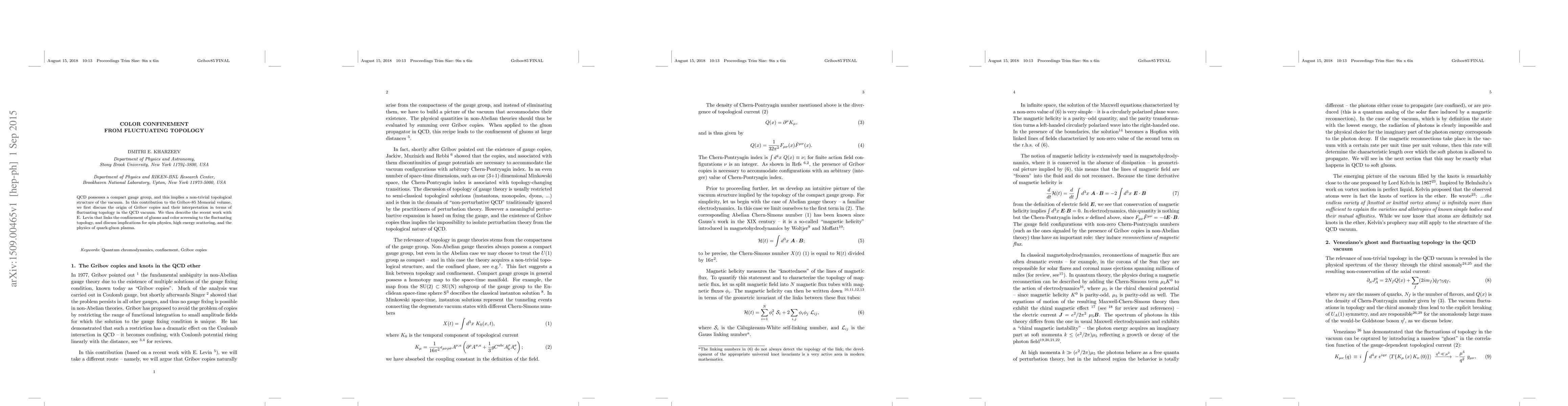 QCD possesses a compact gauge group, and this implies a non-trivial topological structure of the vacuum. In this contribution to the Gribov-85 Memorial volume, we first discuss the origin of Gribov copies and their interpretation in terms of fluctuating topology in the QCD vacuum. We then describe the recent work with E. Levin that links the confinement of gluons and color screening to the fluctuating topology, and discuss implications for spin physics, high energy scattering, and the physics of quark-gluon plasma.