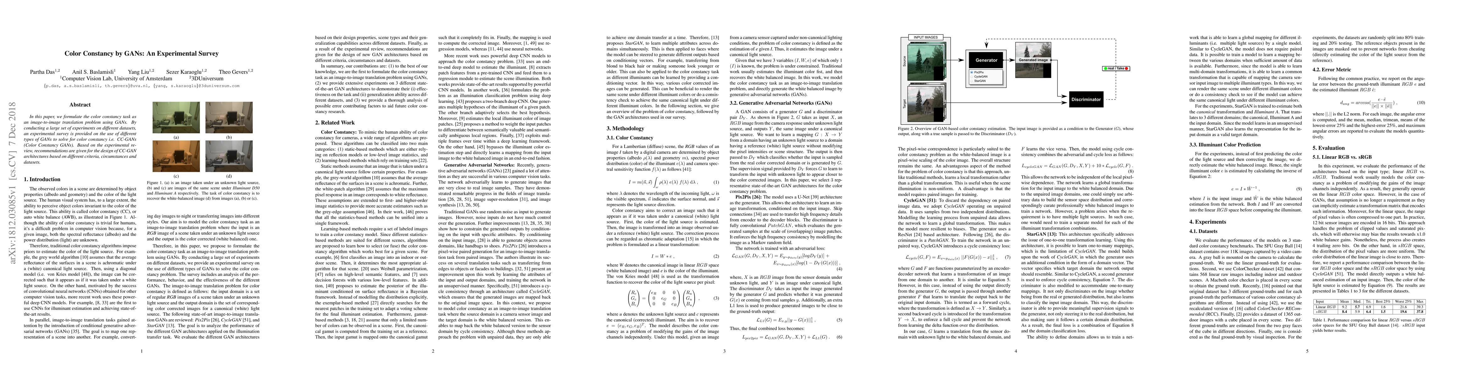 In this paper, we formulate the color constancy task as an image-to-image translation problem using GANs. By conducting a large set of experiments on different datasets, an experimental survey is provided on the use of different types of GANs to solve for color constancy i.e. CC-GANs (Color Constancy GANs). Based on the experimental review, recommendations are given for the design of CC-GAN architectures based on different criteria, circumstances and datasets.
