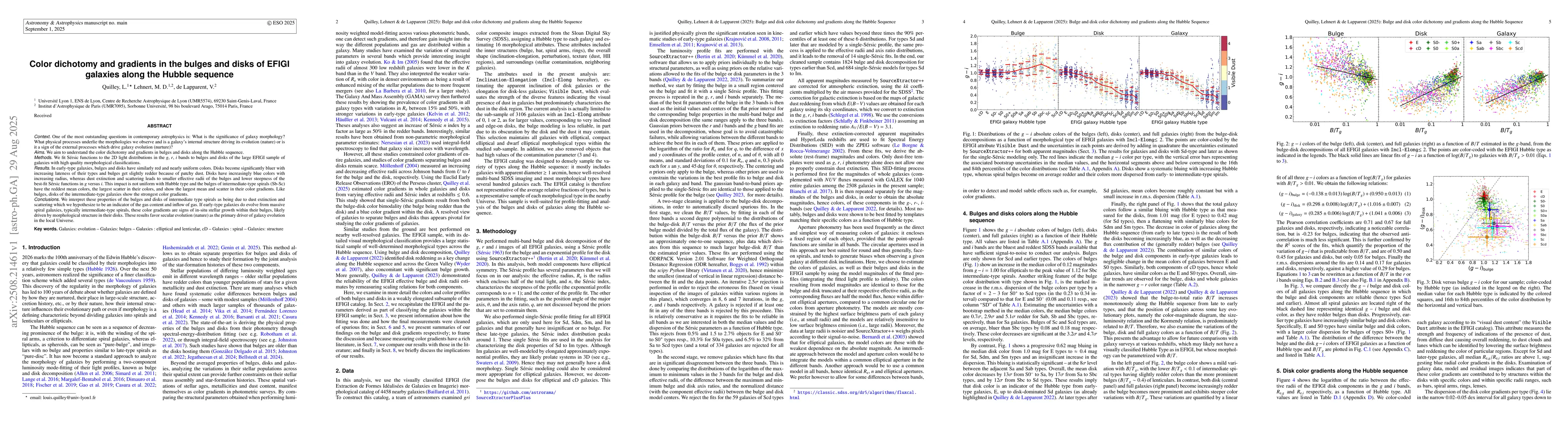 One of the most outstanding questions in contemporary astrophysics is: What is the significance of galaxy morphology? What physical processes underlier the morphologies we observe and is a galaxy's internal structure driving its evolution (nature) or is it a sign of the external processes which drive galaxy evolution (nurture)? We aim to understand the color dichotomy and gradients in bulges and disks along the Hubble sequence. We fit S\'ersic functions to the 2D light distributions in the $g$, $r$, $i$ bands to bulges and disks of the large EFIGI sample of galaxies with high quality morphological classification. In early-type galaxies, bulges and disks have similarly red and nearly uniform colors. Disks become significantly bluer with increasing lateness of their types and bulges get slightly redder because of patchy dust. Disks have increasingly blue colors with increasing radius, whereas dust extinction and scattering leads to smaller effective radii of the bulges and lower steepness of the best-fit S\'ersic profiles in $g$ versus $i$. The impact is not uniform with Hubble type and the bulges of intermediate-type spirals (Sb-Sc) have the reddest mean colors, the largest scatter in their colors, and show the largest mean and scatter in their color gradients. Disks of the intermediate-type galaxies show the strongest color gradients. We interpret these properties of the bulges and disks of intermediate-type spirals as being due to dust extinction and scattering which we hypothesize to be an indicator of the gas content and inflow of gas. if early-type galaxies do evolve from massive spiral galaxies, typically intermediate-type spirals, these color gradients are signs of in-situ stellar growth within their bulges, likely driven by morphological structure in their disk. These results favor secular evolution (nature) as the primary driver of galaxy evolution in the local Universe.
