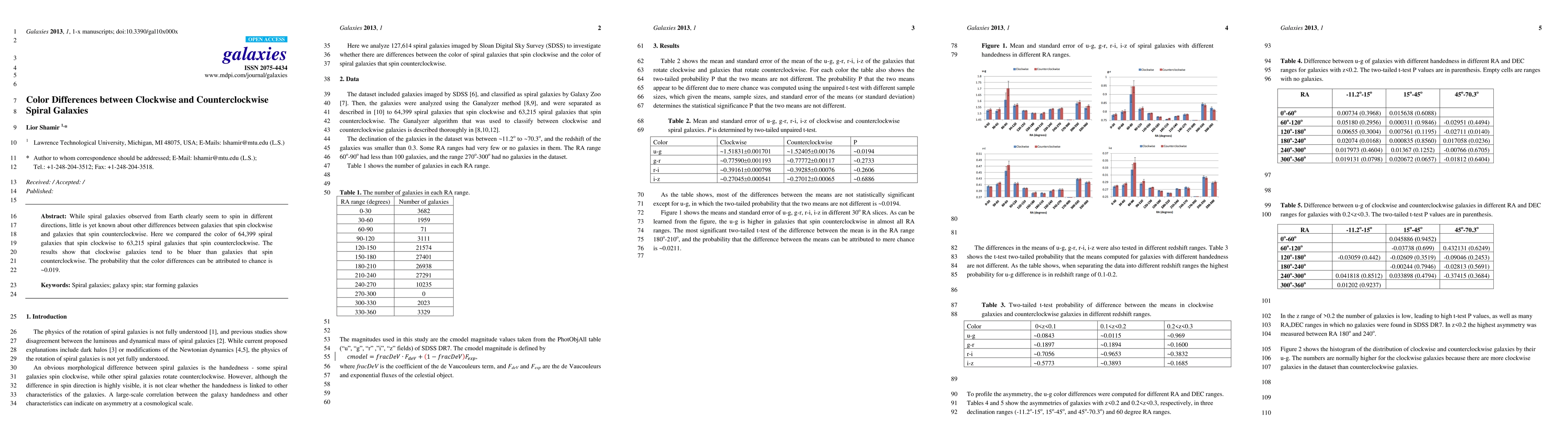 The study compared the color of 64,399 clockwise spiral galaxies to 63,215 counterclockwise spiral galaxies using data from the Sloan Digital Sky Survey (SDSS) to determine color differences based on galaxy rotation direction.