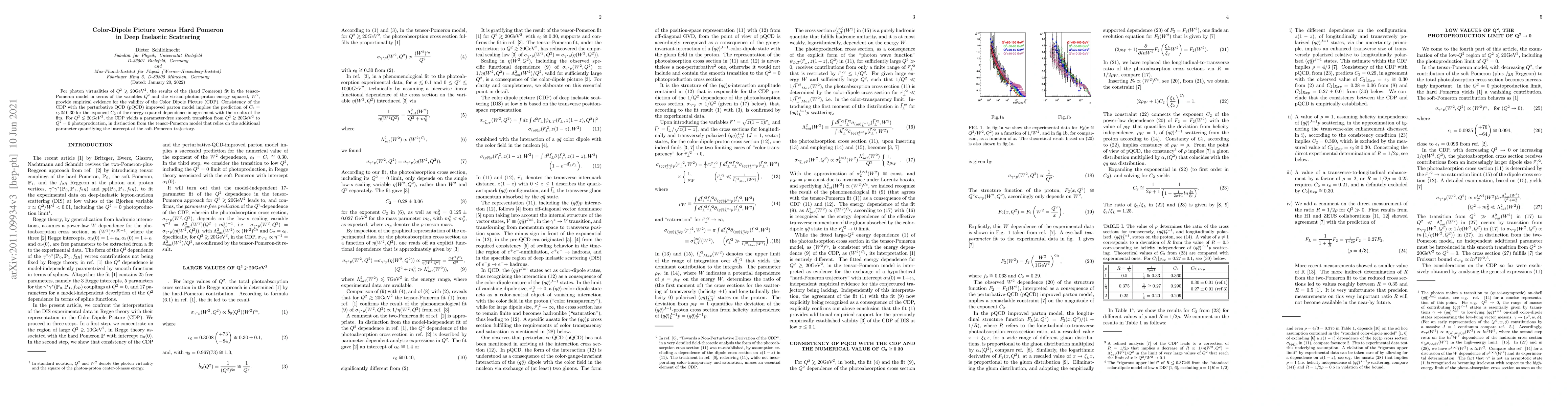 For photon virtualities of $Q^2 \gsim 20 {\rm GeV}^2$, the results of the (hard Pomeron) fit in the tensor-Pomeron model in terms of the variables $Q^2$ and the virtual-photon-proton energy squared, $W^2$, provide empirical evidence for the validity of the Color Dipole Picture (CDP). Consistency of the CDP with the perturbative QCD (pQCD) improved parton model implies the prediction of $C_2 = \epsilon_0 \cong 0.30$ for the exponent $C_2$ of the energy-squared dependence in agreement with the results of the fits. For $Q^2 \lsim 20 GeV^2$, the CDP yields a parameter-free smooth transition from $Q^2 \gsim 20 {\rm GeV}^2$ to $Q^2 = 0$ photoproduction, in distinction from the tensor-Pomeron model that relies on the additional parameter quantifying the intercept of the soft-Pomeron trajectory.