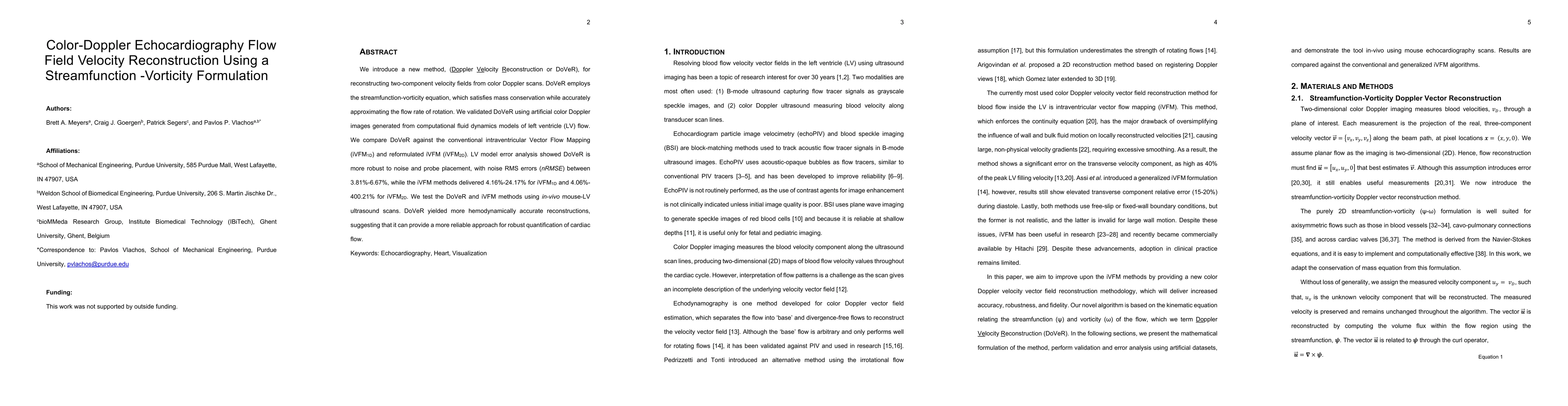 This paper introduces DoVeR, a new method for reconstructing velocity fields from color Doppler scans using a streamfunction-vorticity formulation, which is more robust to noise and probe placement compared to conventional methods. In-vivo tests on mouse left ventricles show DoVeR provides more accurate hemodynamic reconstructions.