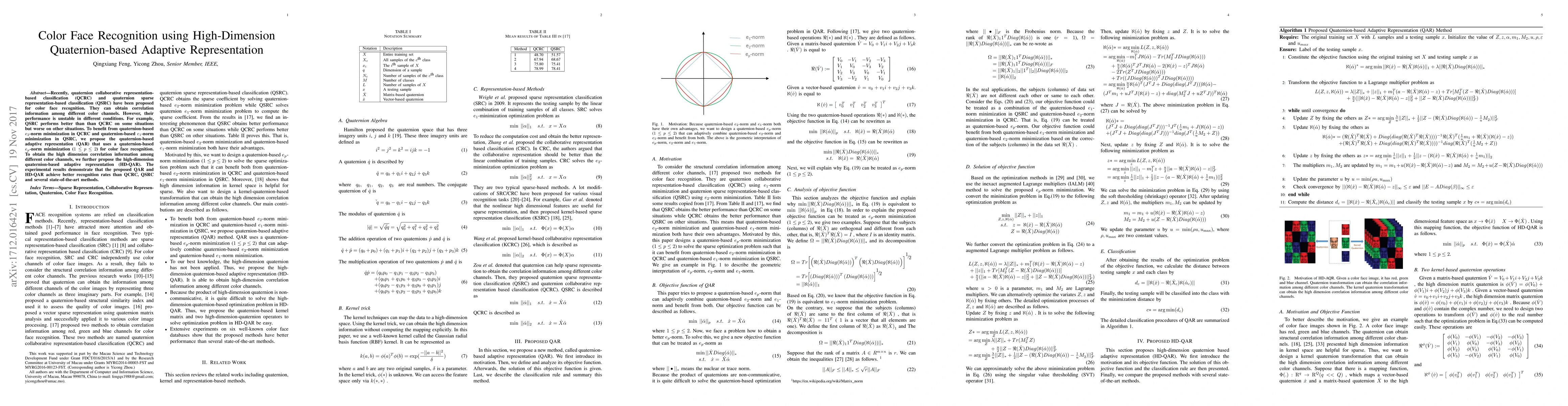 This paper proposes quaternion-based adaptive representation (QAR) and high-dimension quaternion-based adaptive representation (HD-QAR) for color face recognition, utilizing quaternion-based adaptive norm minimization to achieve better performance than existing methods like QCRC and QSRC. Experimental results show improved recognition rates.