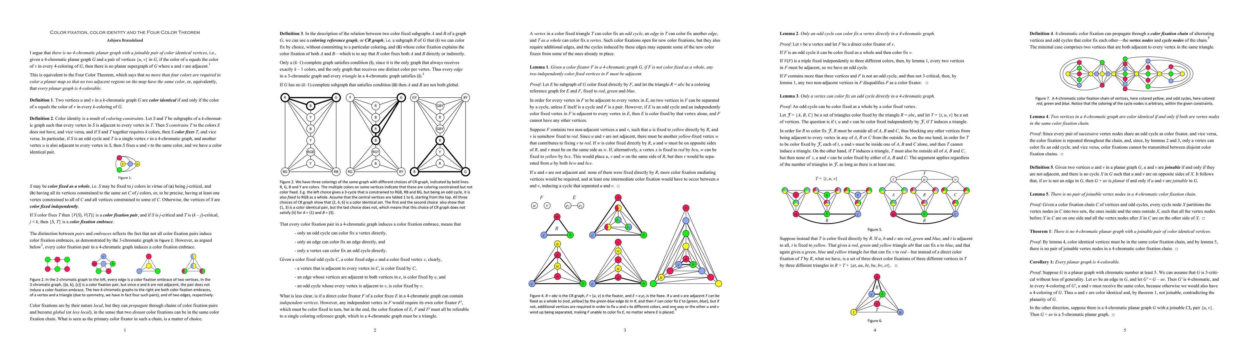 I argue that there is no 4-chromatic planar graph with a joinable pair of color identical vertices, i.e., given a 4-chromatic planar graph G and a pair of vertices {u, v} in G, if the color of u equals the color of v in every 4-coloring of G, then there is no planar supergraph of G where u and v are adjacent. This is equivalent to the Four Color Theorem. (My argument is a variation of my argument in arXiv:1402.7368)
