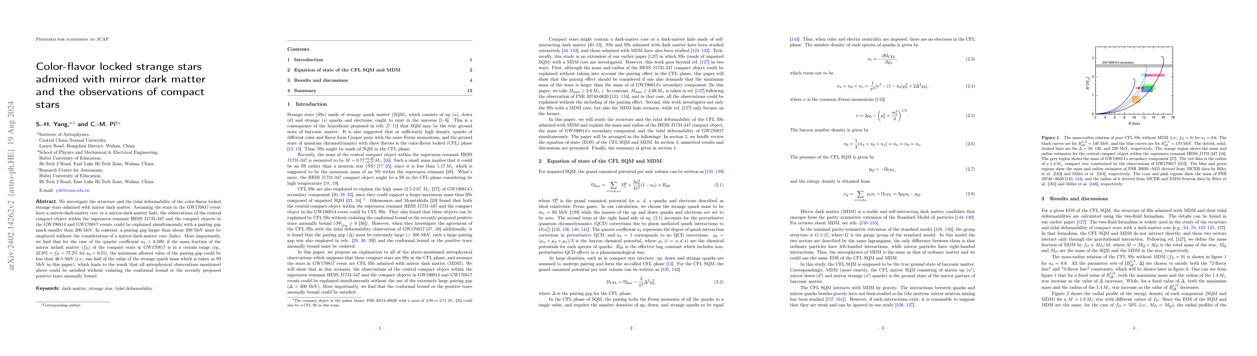 This paper explores the structure and tidal deformability of color-flavor locked strange stars with a mirror-dark-matter core, suggesting that such stars can explain observations from GW170817, HESS J1731-347, and GW190814 events, especially when the pairing gap is small. It concludes that a sufficiently large mirror-dark-matter core can allow for a pairing gap less than half the strange quark mass, satisfying astrophysical constraints.