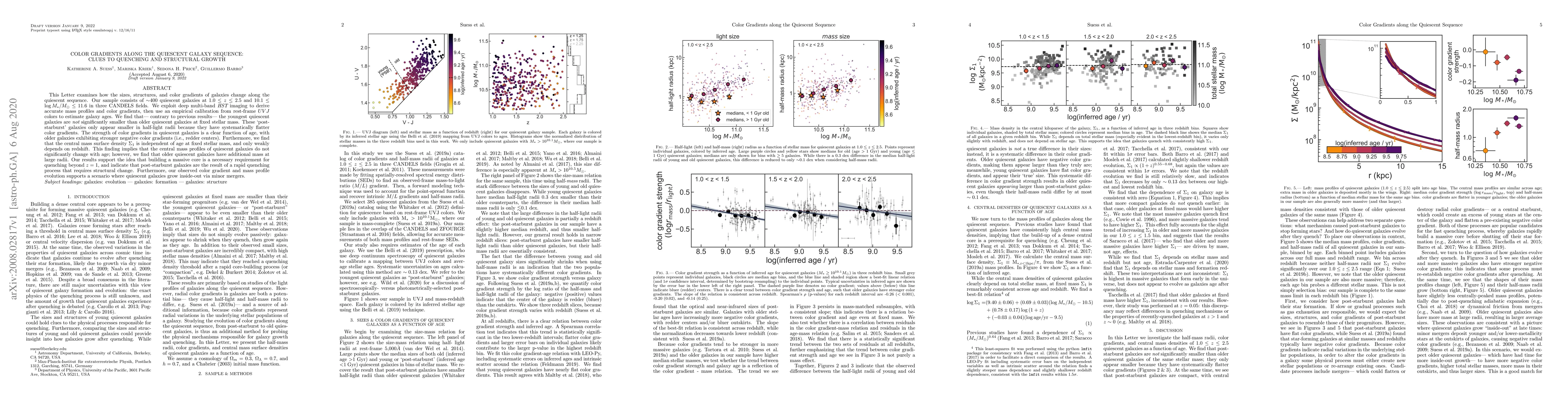 This Letter examines how the sizes, structures, and color gradients of galaxies change along the quiescent sequence. Our sample consists of ~400 quiescent galaxies at $1.0\le z\le2.5$ and $10.1 \le \log{M_*/M_\odot}\le11.6$ in three CANDELS fields. We exploit deep multi-band HST imaging to derive accurate mass profiles and color gradients, then use an empirical calibration from rest-frame UVJ colors to estimate galaxy ages. We find that -- contrary to previous results -- the youngest quiescent galaxies are not significantly smaller than older quiescent galaxies at fixed stellar mass. These `post-starburst' galaxies only appear smaller in half-light radii because they have systematically flatter color gradients. The strength of color gradients in quiescent galaxies is a clear function of age, with older galaxies exhibiting stronger negative color gradients (i.e., redder centers). Furthermore, we find that the central mass surface density $\Sigma_1$ is independent of age at fixed stellar mass, and only weakly depends on redshift. This finding implies that the central mass profiles of quiescent galaxies do not significantly change with age; however, we find that older quiescent galaxies have additional mass at large radii. Our results support the idea that building a massive core is a necessary requirement for quenching beyond $z=1$, and indicate that post-starburst galaxies are the result of a rapid quenching process that requires structural change. Furthermore, our observed color gradient and mass profile evolution supports a scenario where quiescent galaxies grow inside-out via minor mergers.