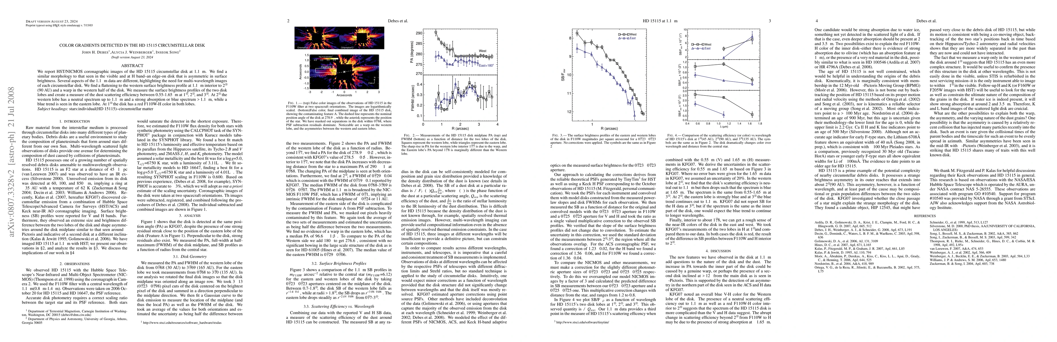 We report HST/NICMOS coronagraphic images of the HD 15115 circumstellar disk at 1.1\micron. We find a similar morphology to that seen in the visible and at H band--an edge-on disk that is asymmetric in surface brightness. Several aspects of the 1.1\micron data are different, highlighting the need for multi-wavelength images of each circumstellar disk. We find a flattening to the western surface brightness profile at 1.1\micron interior to 2\arcsec (90 AU) and a warp in the western half of the disk. We measure the surface brightness profiles of the two disk lobes and create a measure of the dust scattering efficiency between 0.55-1.65\micron at 1\arcsec, 2\arcsec, and 3\arcsec. At 2\arcsec the western lobe has a neutral spectrum up to 1.1\micron and a strong absorption or blue spectrum $>$1.1\micron, while a blue trend is seen in the eastern lobe. At 1\arcsec the disk has a red F110W-H color in both lobes.