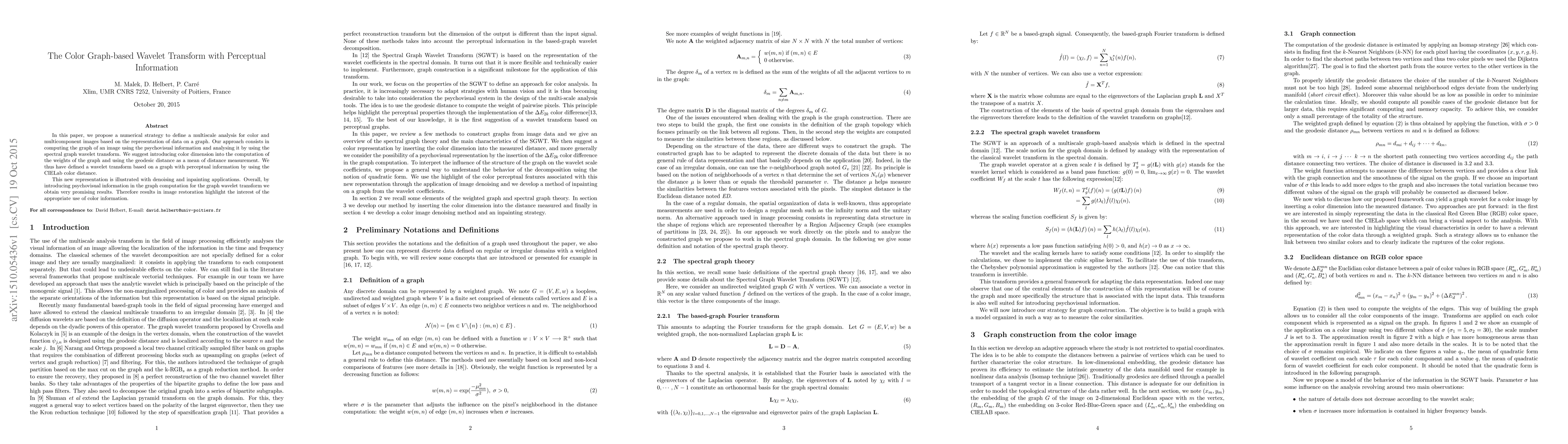 In this paper, we propose a numerical strategy to define a multiscale analysis for color and multicomponent images based on the representation of data on a graph. Our approach consists in computing the graph of an image using the psychovisual information and analysing it by using the spectral graph wavelet transform. We suggest introducing color dimension into the computation of the weights of the graph and using the geodesic distance as a means of distance measurement. We thus have defined a wavelet transform based on a graph with perceptual information by using the CIELab color distance. This new representation is illustrated with denoising and inpainting applications. Overall, by introducing psychovisual information in the graph computation for the graph wavelet transform we obtain very promising results. Therefore results in image restoration highlight the interest of the appropriate use of color information.