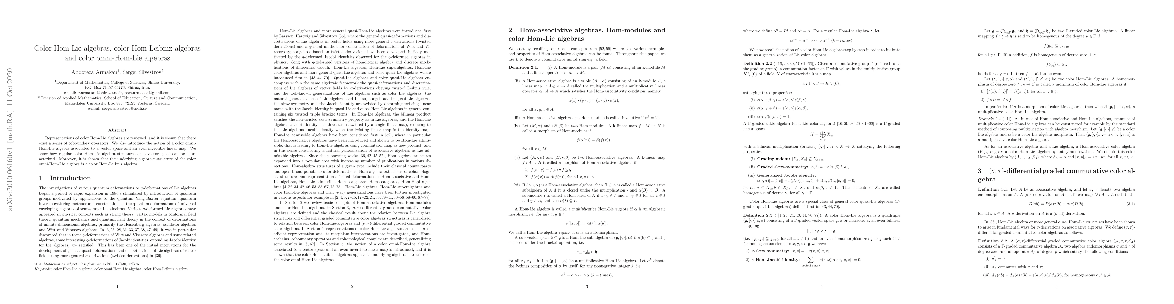 This paper reviews representations of color Hom-Lie algebras and introduces color omni-Hom-Lie algebras, which are characterized by an even invertible linear map. It also demonstrates the relationship between color Hom-Lie algebras and color Hom-Leibniz algebras through coboundary operators.