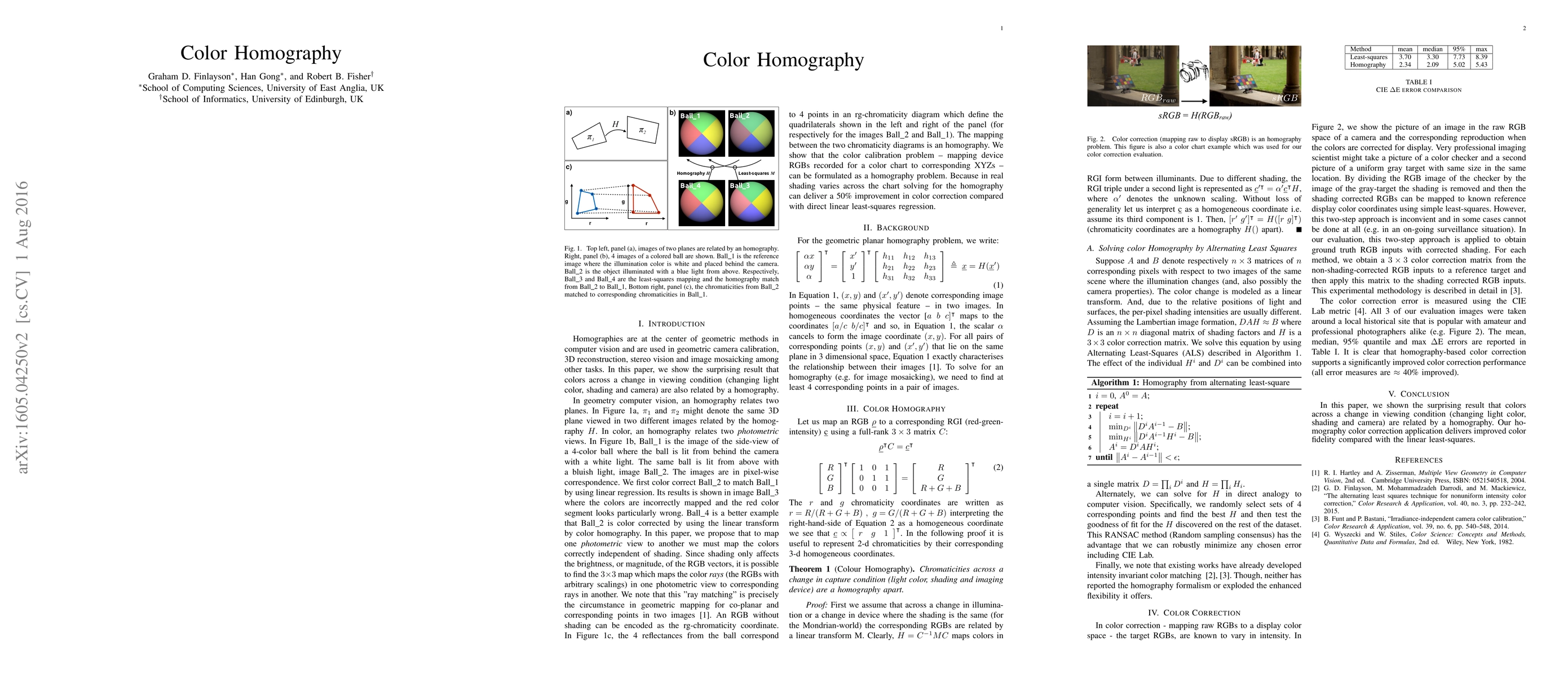 We show the surprising result that colors across a change in viewing condition (changing light color, shading and camera) are related by a homography. Our homography color correction application delivers improved color fidelity compared with the linear least-square.