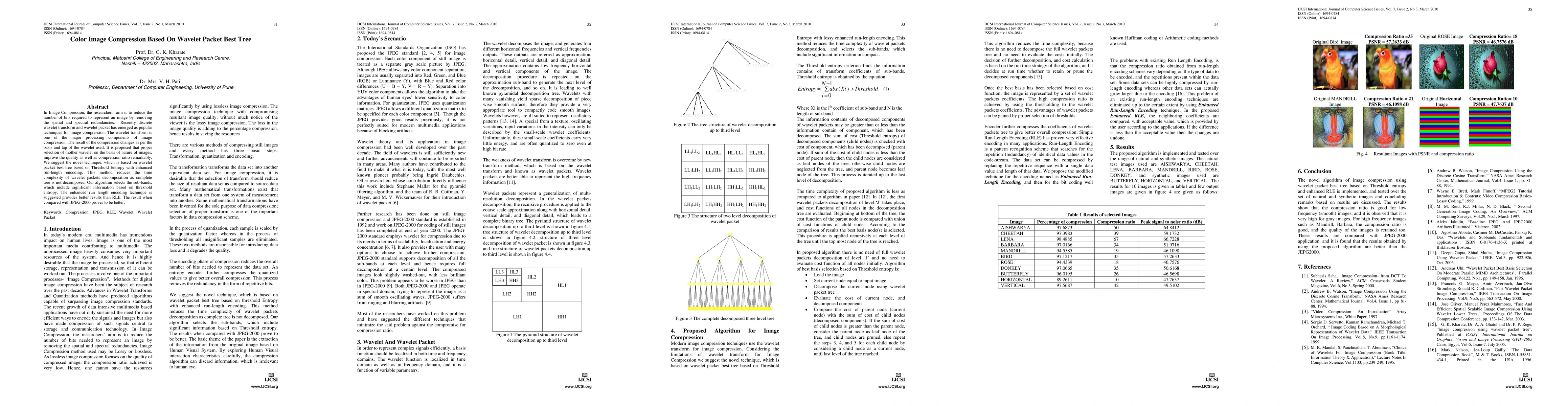 This paper proposes a novel wavelet packet best tree-based compression technique for color images, utilizing threshold entropy and enhanced run-length encoding to improve compression ratio and quality. Compared to JPEG-2000, the method shows superior results by reducing time complexity and selecting significant sub-bands.