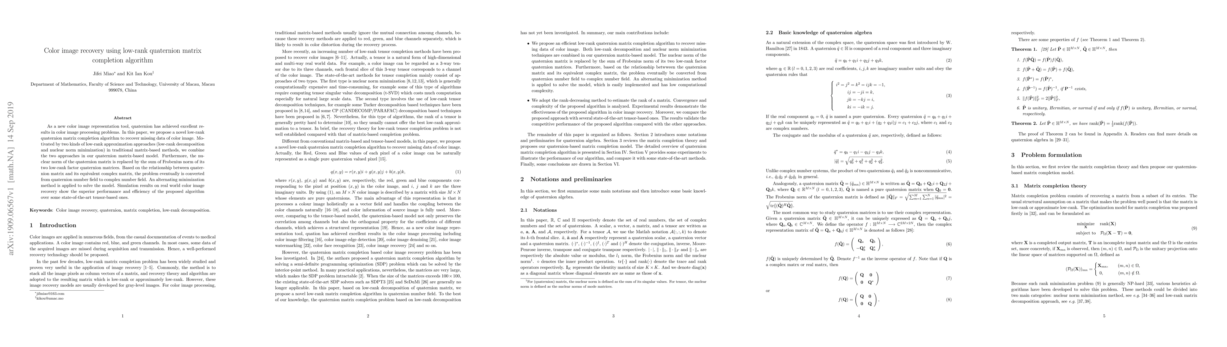 This paper introduces a low-rank quaternion matrix completion algorithm for recovering missing data in color images. It combines low-rank decomposition and nuclear norm minimization to enhance performance, showing superior results in simulations compared to tensor-based methods.