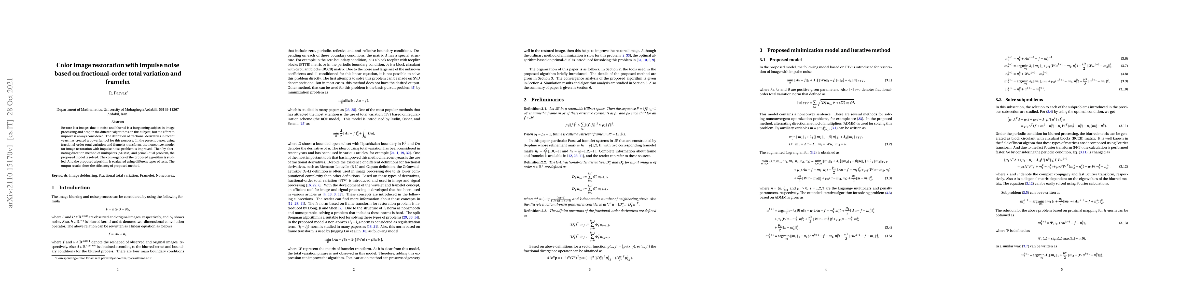This paper proposes an improved nonconvex model for color image restoration under impulse noise using fractional-order total variation and framelet transform. The model is solved using the alternating direction method of multipliers (ADMM) and evaluated through various tests, demonstrating its effectiveness.