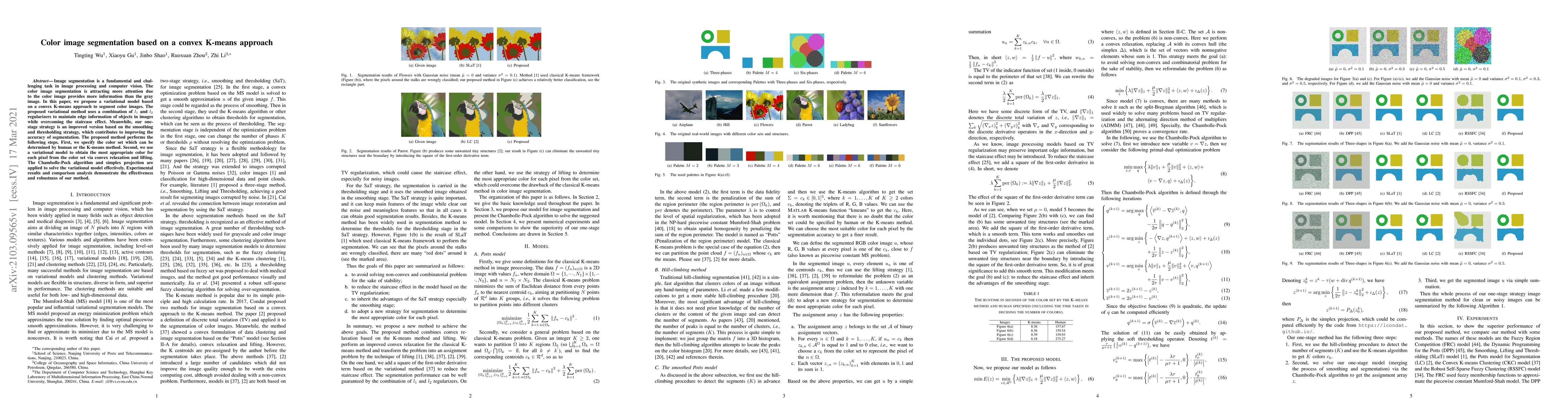 This paper presents a variational model based on a convex K-means approach for color image segmentation, combining $l_1$ and $l_2$ regularizers to preserve edge details and mitigate the staircase effect. The method employs a one-stage strategy with smoothing and thresholding to enhance segmentation accuracy.