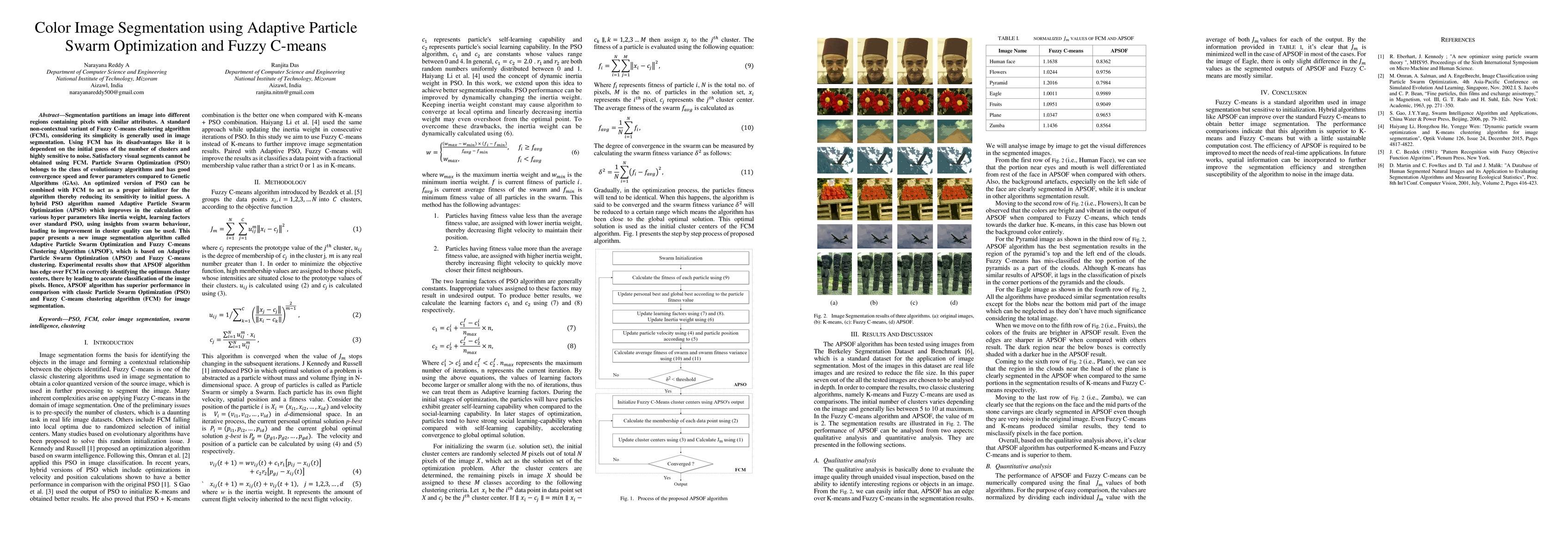 This paper proposes the Adaptive Particle Swarm Optimization and Fuzzy C-means Clustering Algorithm (APSOF) to improve image segmentation by combining Adaptive Particle Swarm Optimization with Fuzzy C-means clustering, achieving better cluster center identification and pixel classification compared to traditional FCM and PSO methods.