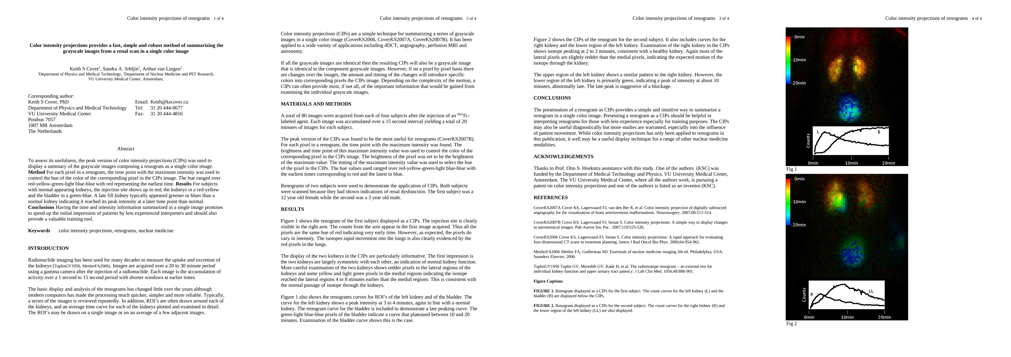 To assess its usefulness, the peak version of color intensity projections (CIPs) was used to display a summary of the grayscale images composing a renogram as a single color image. Method For each pixel in a renogram, the time point with the maximum intensity was used to control the hue of the color of the corresponding pixel in the CIPs image. The hue ranged over red-yellow-green-light blue-blue with red representing the earliest time. Results For subjects with normal appearing kidneys, the injection site shows up in red, the kidneys in a red-yellow and the bladder in a green-blue. A late fill kidney typically appeared greener or bluer than a normal kidney indicating it reached its peak intensity at a later time point than normal. Conclusions Having the time and intensity information summarized in a single image promises to speed up the initial impression of patients by less experienced interpreters and should also provide a valuable training tool.
