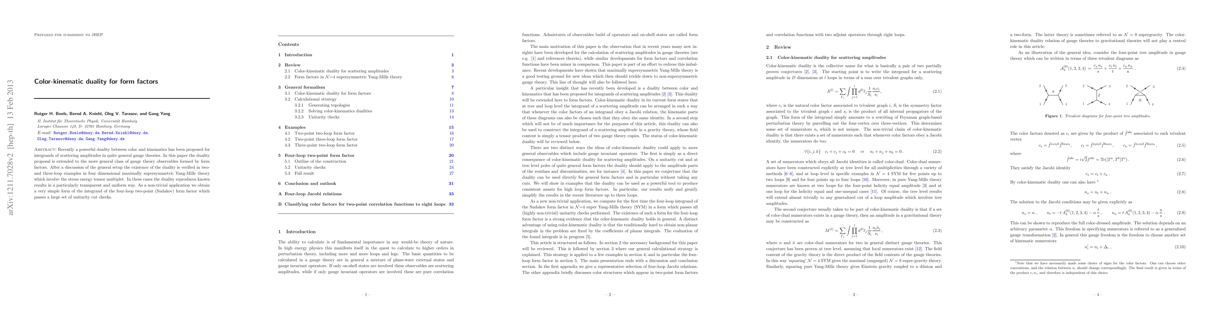 This paper extends the color-kinematic duality, which connects color and kinematics in scattering amplitudes, to form factors in gauge theories. It verifies the duality in examples from four-dimensional supersymmetric Yang-Mills theory and presents a simplified form for the four-loop two-point form factor integrand that passes numerous unitarity cut tests.