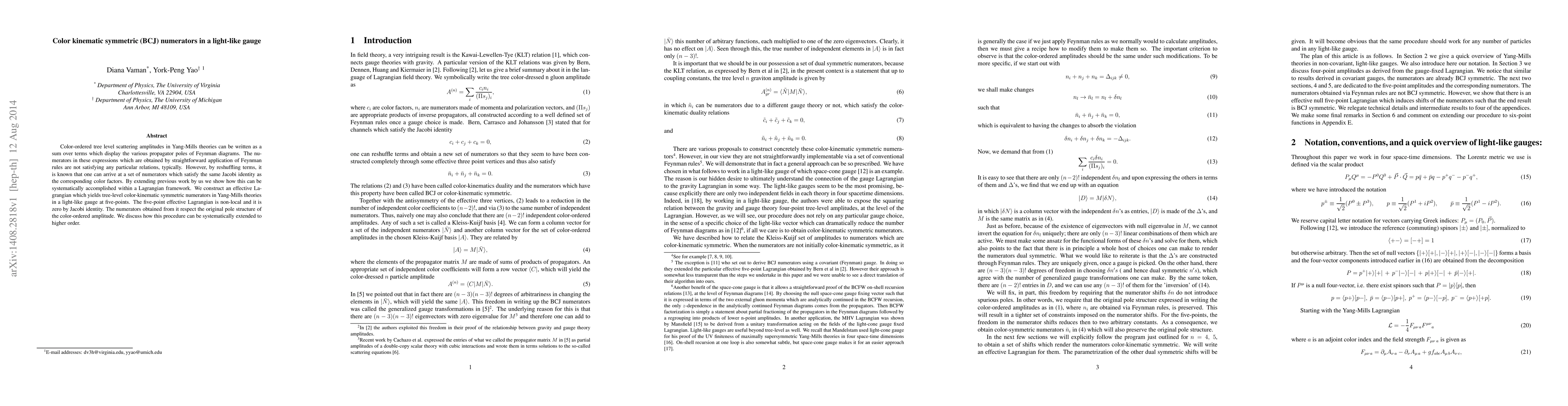 Color-ordered tree level scattering amplitudes in Yang-Mills theories can be written as a sum over terms which display the various propagator poles of Feynman diagrams. The numerators in these expressions which are obtained by straightforward application of Feynman rules are not satisfying any particular relations, typically. However, by reshuffling terms, it is known that one can arrive at a set of numerators which satisfy the same Jacobi identity as the corresponding color factors. By extending previous work by us we show how this can be systematically accomplished within a Lagrangian framework. We construct an effective Lagrangian which yields tree-level color-kinematic symmetric numerators in Yang-Mills theories in a light-like gauge at five-points. The five-point effective Lagrangian is non-local and it is zero by Jacobi identity. The numerators obtained from it respect the original pole structure of the color-ordered amplitude. We discuss how this procedure can be systematically extended to higher order.