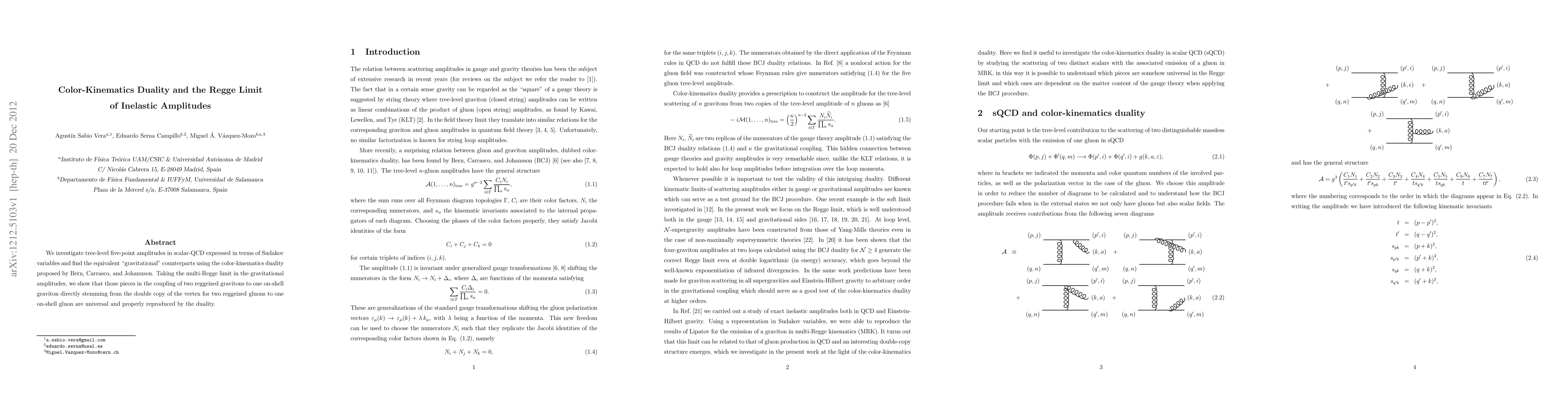 This paper explores tree-level five-point amplitudes in scalar-QCD, applying color-kinematics duality to find their gravitational equivalents. It demonstrates that the multi-Regge limit of these amplitudes reveals universal couplings of two reggeized gravitons to one on-shell graviton, consistent with the dual structure from gluons.
