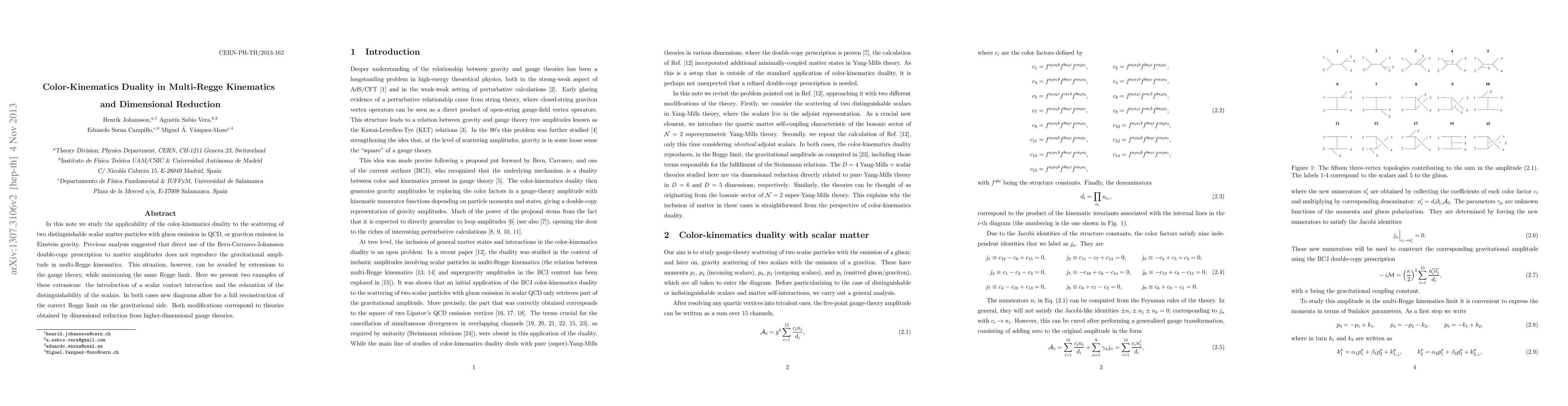 In this note we study the applicability of the color-kinematics duality to the scattering of two distinguishable scalar matter particles with gluon emission in QCD, or graviton emission in Einstein gravity. Previous analysis suggested that direct use of the Bern-Carrasco-Johansson double-copy prescription to matter amplitudes does not reproduce the gravitational amplitude in multi-Regge kinematics. This situation, however, can be avoided by extensions to the gauge theory, while maintaning the same Regge limit. Here we present two examples of these extensions: the introduction of a scalar contact interaction and the relaxation of the distinguishability of the scalars. In both cases new diagrams allow for a full reconstruction of the correct Regge limit on the gravitational side. Both modifications correspond to theories obtained by dimensional reduction from higher-dimensional gauge theories.