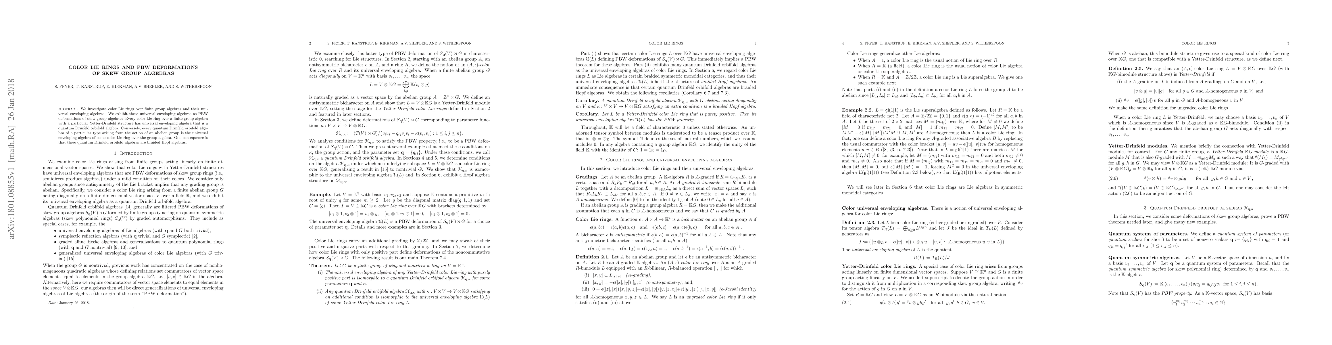 Summary: The paper explores color Lie rings over finite group algebras and their universal enveloping algebras, demonstrating that these algebras are PBW deformations of skew group algebras. It establishes a connection between color Lie rings and quantum Drinfeld orbifold algebras, proving they are braided Hopf algebras.