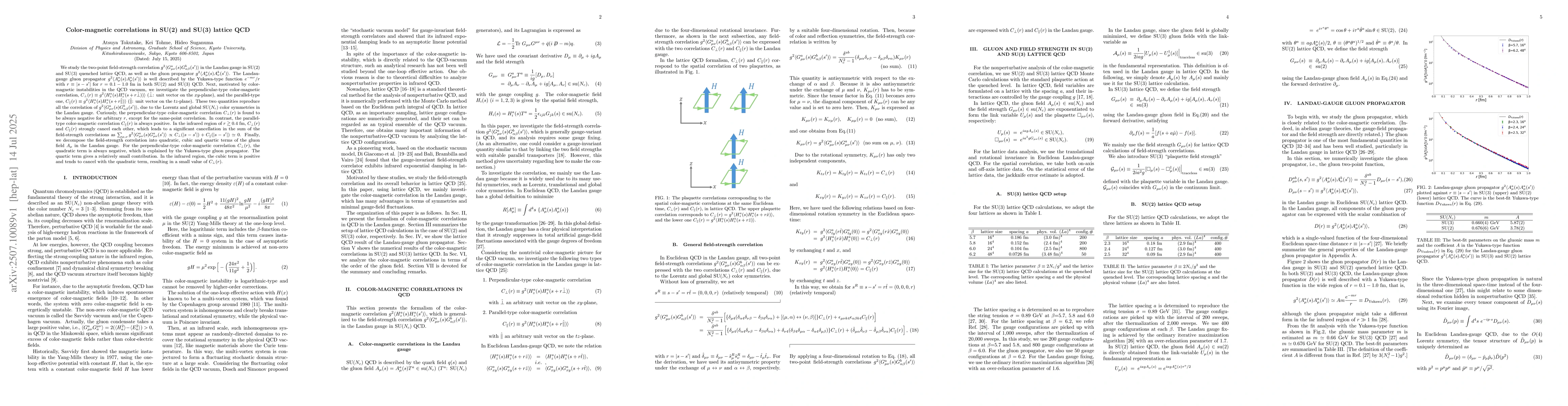 We study the two-point field-strength correlation $g^2 \langle G_{\mu\nu}^a(s)G^b_{\alpha\beta}(s') \rangle$ in the Landau gauge in SU(2) and SU(3) quenched lattice QCD, as well as the gluon propagator $g^2 \langle A_\mu^a (s)A_\nu^b(s') \rangle$. The Landau-gauge gluon propagator $g^2 \langle A_\mu^a (s)A_\mu^a(s') \rangle$ is well described by the Yukawa-type function $e^{-mr}/r$ with $r\equiv |s-s'|$ for $r=0.1-1.0~{\rm fm}$ in both SU(2) and SU(3) QCD. Next, motivated by color-magnetic instabilities in the QCD vacuum, we investigate the perpendicular-type color-magnetic correlation, $C_{\perp}(r) \equiv g^2\langle H_z^a(s)H_z^a(s + r \hat \perp)) \rangle$ ($\hat \perp$: unit vector on the $xy$-plane), and the parallel-type one, $C_{\parallel}(r) \equiv g^2 \langle H_z^a(s)H_z^a(s + r \hat \parallel) \rangle$ ($\hat \parallel$: unit vector on the $tz$-plane). These two quantities reproduce all the correlation of $g^2\langle G^a_{\mu\nu}(s)G^b_{\alpha\beta}(s')\rangle$, due to the Lorentz and global SU($N_c$) color symmetries in the Landau gauge. Curiously, the perpendicular-type color-magnetic correlation $C_{\perp}(r)$ is found to be always negative for arbitrary $r$, except for the same-point correlation. In contrast, the parallel-type color-magnetic correlation $C_{\parallel}(r)$ is always positive. In the infrared region of $r \gtrsim 0.4~{\rm fm}$, $C_{\perp}(r)$ and $C_{\parallel}(r)$ strongly cancel each other, which leads to a significant cancellation in the sum of the field-strength correlations as $\sum_{\mu, \nu} g^2\langle G^a_{\mu\nu}(s)G^a_{\mu\nu}(s')\rangle \propto C_{\perp}(|s-s'|)+ C_{\parallel}(|s-s'|) \simeq 0$. Finally, we decompose the field-strength correlation into quadratic, cubic and quartic terms of the gluon field $A_\mu$ in the Landau gauge.
