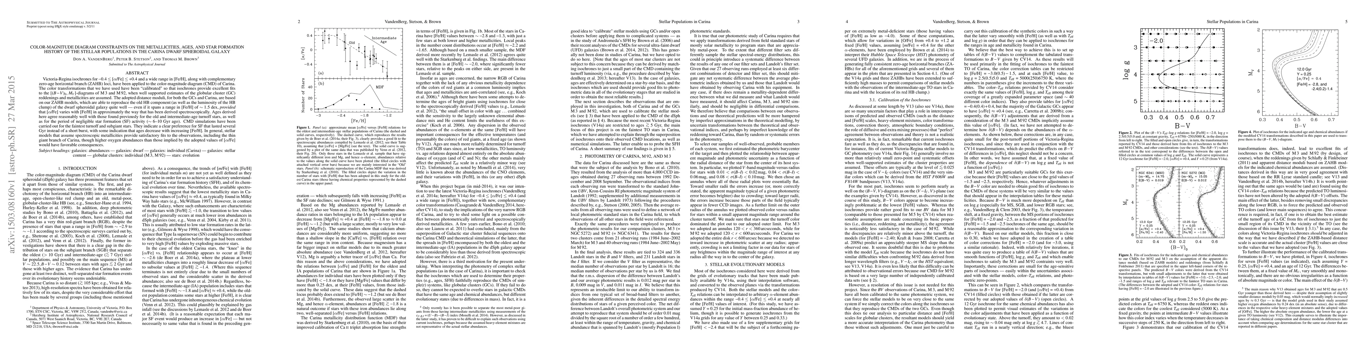 Victoria-Regina isochrones for $-0.4 \le$ [alpha/Fe] $\le +0.4$ and a wide range in [Fe/H], along with complementary zero-age horizontal branch (ZAHB) loci, have been applied to the color-magnitude diagram (CMD) of Carina. The color transformations that we have used have been "calibrated" so that isochrones provide excellent fits to the $[(B-V)_0,\,M_V]$-diagrams of M3 and M92, when well supported estimates of the globular cluster (GC) reddenings and metallicities are assumed. The adopted distance moduli, for both the GCs and Carina, are based on our ZAHB models, which are able to reproduce the old HB component (as well as the luminosity of the HB clump) of the dwarf spheroidal galaxy quite well --- even if it spans a range in [Fe/H] of ~ 1.5 dex, provided that [alpha/Fe] varies with [Fe/H] in approximately the way that has been derived spectroscopically. Ages derived here agree reasonably well with those found previously for the old and intermediate-age turnoff stars, as well as for the period of negligible star formation (SF) activity (~ 6-10 Gyr ago). CMD simulations have been carried out for the faintest turnoff and subgiant stars. They indicate a clear preference for SF that lasted several Gyr instead of a short burst, with some indication that ages decrease with increasing [Fe/H]. In general, stellar models that assume spectroscopic metallicities provide satisfactory fits to the observations, including the thin giant branch of Carina, though higher oxygen abundances than those implied by the adopted values of [alpha/Fe] would have favorable consequences.