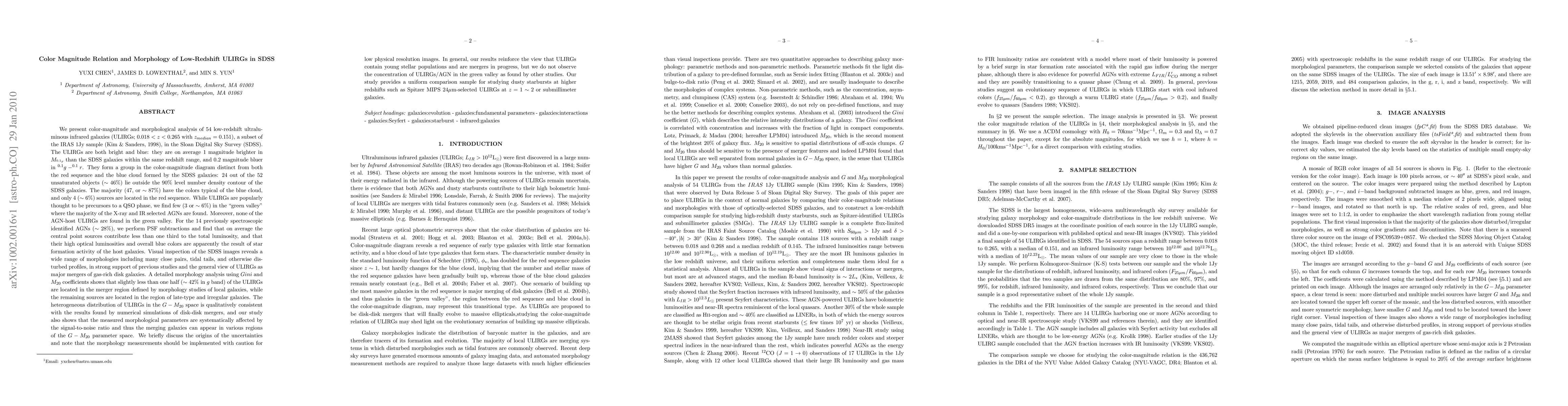 This study of 54 low-redshift ULIRGs reveals they're brighter than typical SDSS galaxies, predominantly blue, with few in the 'green valley' and none harboring an AGN despite 28% being AGNs. Morphological analysis using Gini and M20 coefficients shows most are mergers in progress, reinforcing the view of ULIRGs as young stellar systems resulting from galaxy mergers.