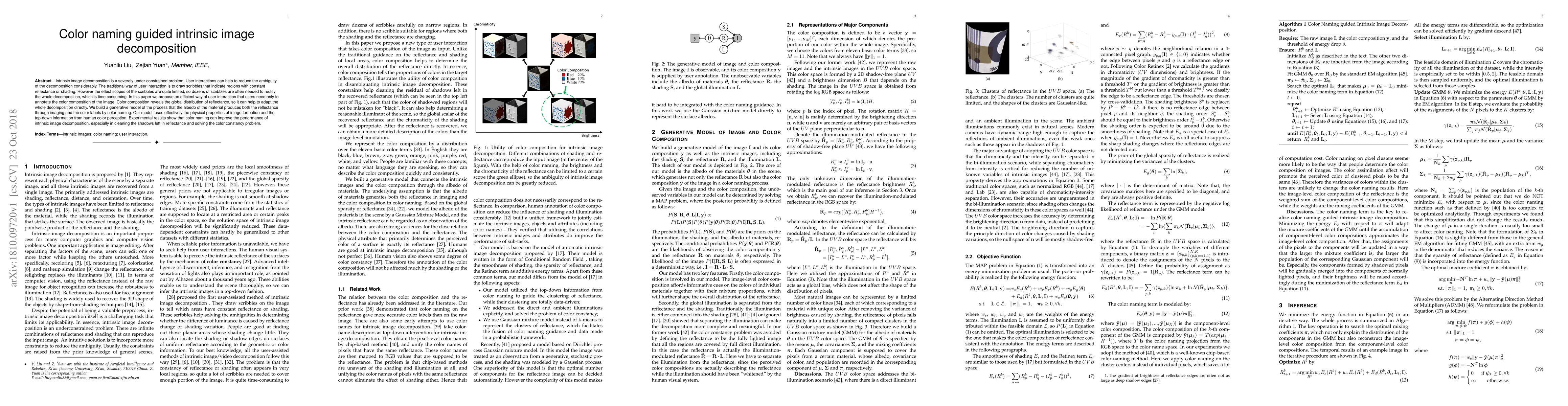 Intrinsic image decomposition is a severely under-constrained problem. User interactions can help to reduce the ambiguity of the decomposition considerably. The traditional way of user interaction is to draw scribbles that indicate regions with constant reflectance or shading. However the effect scopes of the scribbles are quite limited, so dozens of scribbles are often needed to rectify the whole decomposition, which is time consuming. In this paper we propose an efficient way of user interaction that users need only to annotate the color composition of the image. Color composition reveals the global distribution of reflectance, so it can help to adapt the whole decomposition directly. We build a generative model of the process that the albedo of the material produces both the reflectance through imaging and the color labels by color naming. Our model fuses effectively the physical properties of image formation and the top-down information from human color perception. Experimental results show that color naming can improve the performance of intrinsic image decomposition, especially in cleaning the shadows left in reflectance and solving the color constancy problem.