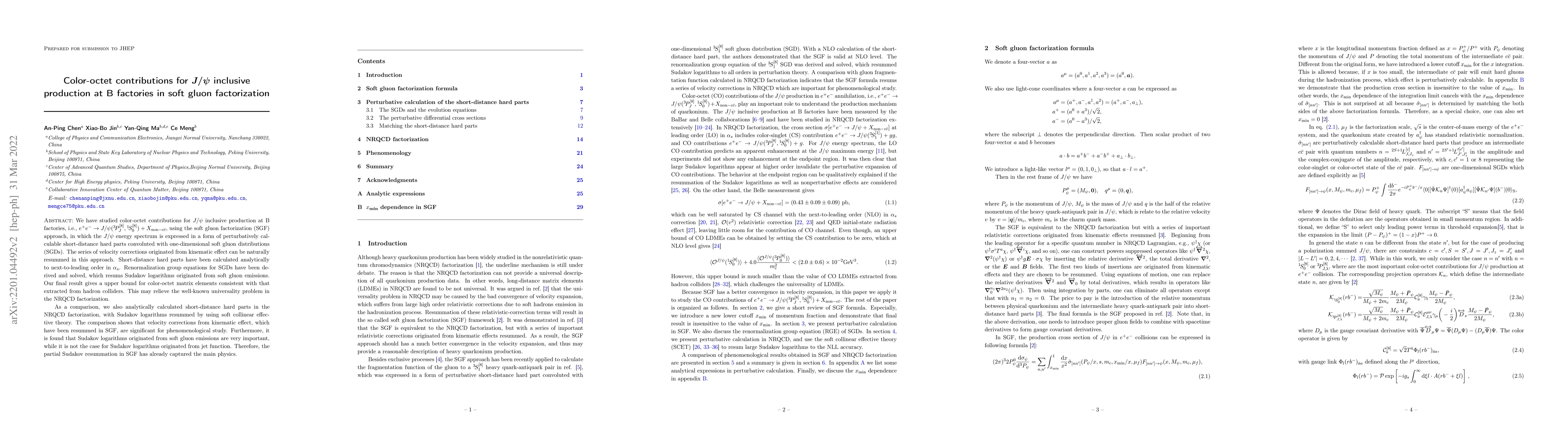 This paper explores color-octet contributions to $J/\psi$ inclusive production at B factories using the soft gluon factorization approach, which resums kinematic effects and Sudakov logarithms. The study provides an upper bound for color-octet matrix elements, potentially resolving the universality problem in NRQCD factorization, and highlights the significance of kinematic velocity corrections and soft gluon emissions.