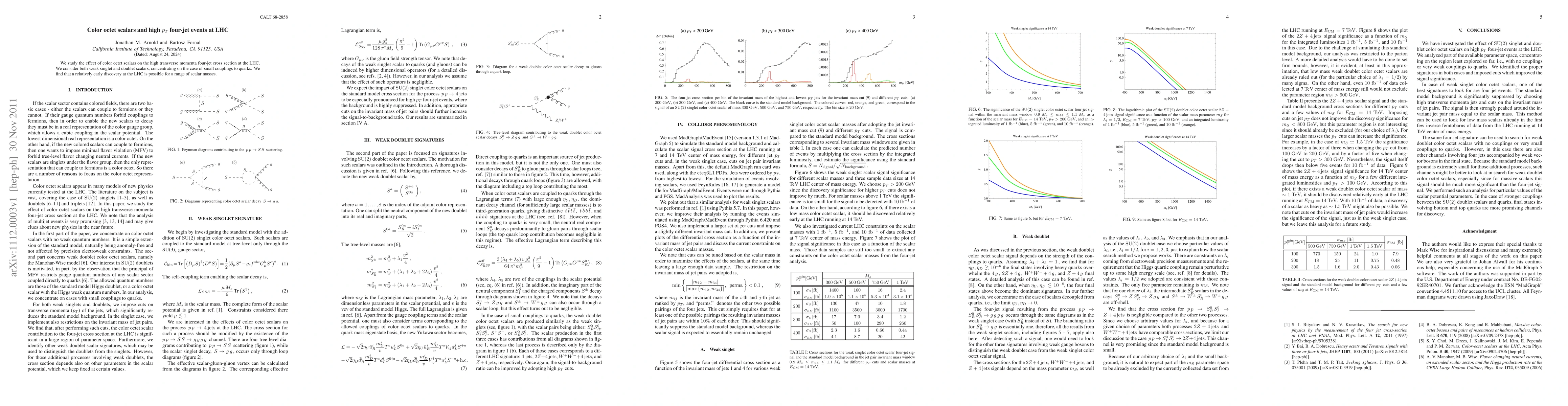 Summary: The paper investigates the impact of color octet scalars on high transverse momentum four-jet events at the LHC, finding that weak singlet and doublet scalars with small quark couplings could lead to early discovery within certain mass ranges.