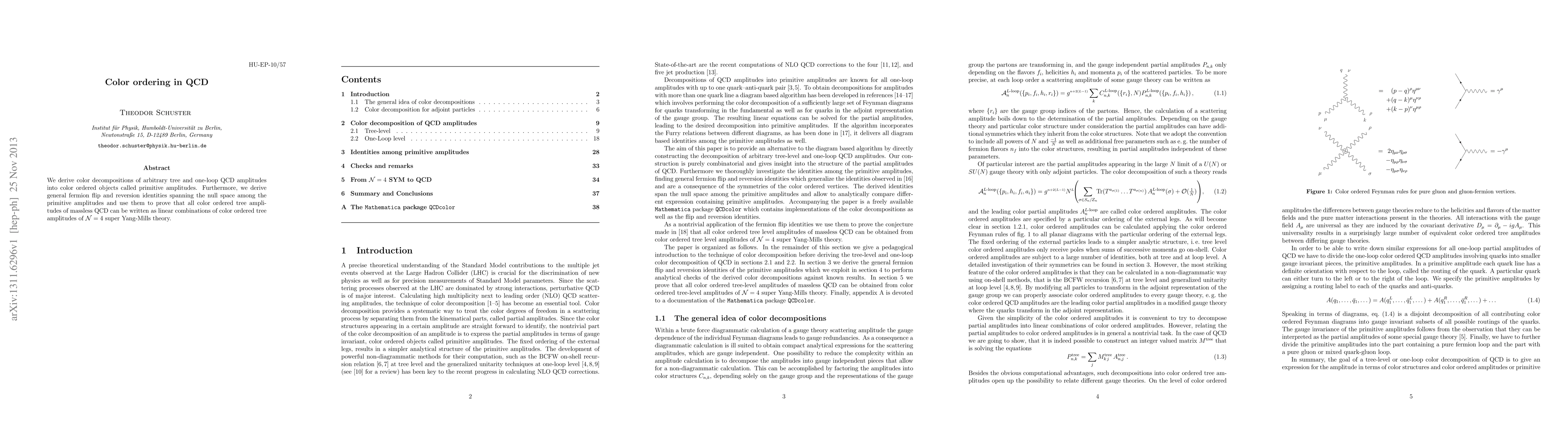 We derive color decompositions of arbitrary tree and one-loop QCD amplitudes into color ordered objects called primitive amplitudes. Furthermore, we derive general fermion flip and reversion identities spanning the null space among the primitive amplitudes and use them to prove that all color ordered tree amplitudes of massless QCD can be written as linear combinations of color ordered tree amplitudes of $\mathcal{N}=4$ super Yang-Mills theory.