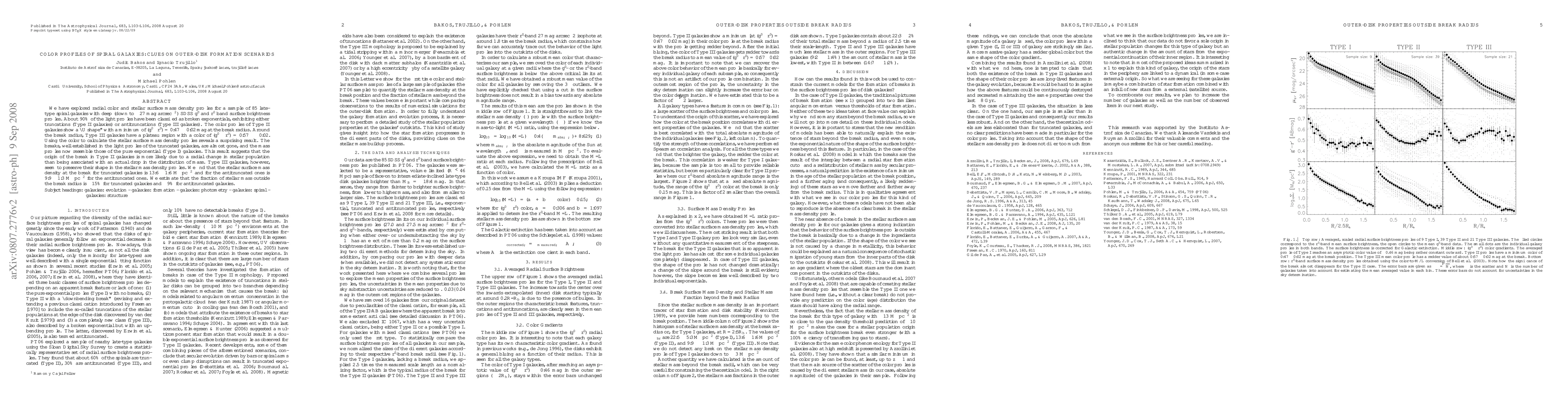 This study investigates the radial color and stellar surface mass density profiles of 85 late-type spiral galaxies, revealing that breaks in light profiles are likely due to changes in stellar populations rather than mass distribution. Truncated galaxies show a "U shape" in color profiles, while antitruncated galaxies have plateau regions, suggesting different formation scenarios for outer disks.