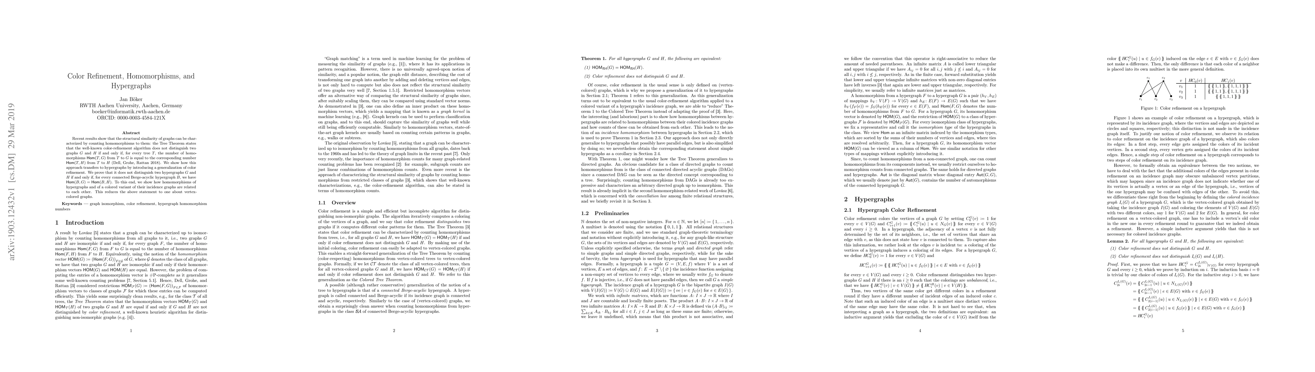 Recent results show that the structural similarity of graphs can be characterized by counting homomorphisms to them: the Tree Theorem states that the well-known color-refinement algorithm does not distinguish two graphs G and H if and only if, for every tree T, the number of homomorphisms Hom(T,G) from T to G is equal to the corresponding number Hom(T,H) from T to H (Dell, Grohe, Rattan 2018). We show how this approach transfers to hypergraphs by introducing a generalization of color refinement. We prove that it does not distinguish two hypergraphs G and H if and only if, for every connected Berge-acyclic hypergraph B, we have Hom(B,G) = Hom(B,H). To this end, we show how homomorphisms of hypergraphs and of a colored variant of their incidence graphs are related to each other. This reduces the above statement to one about vertex-colored graphs.