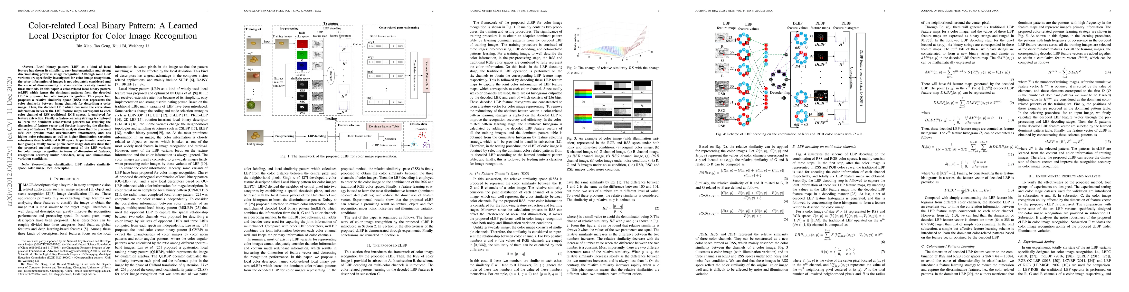 This paper introduces a color-related local binary pattern (cLBP) for color image recognition, employing a relative similarity space (RSS) to describe color similarity and a feature learning strategy to extract dominant patterns. Experimental results show superior performance over other LBP variants in terms of feature dimension, accuracy, and robustness to noise and illumination variations.