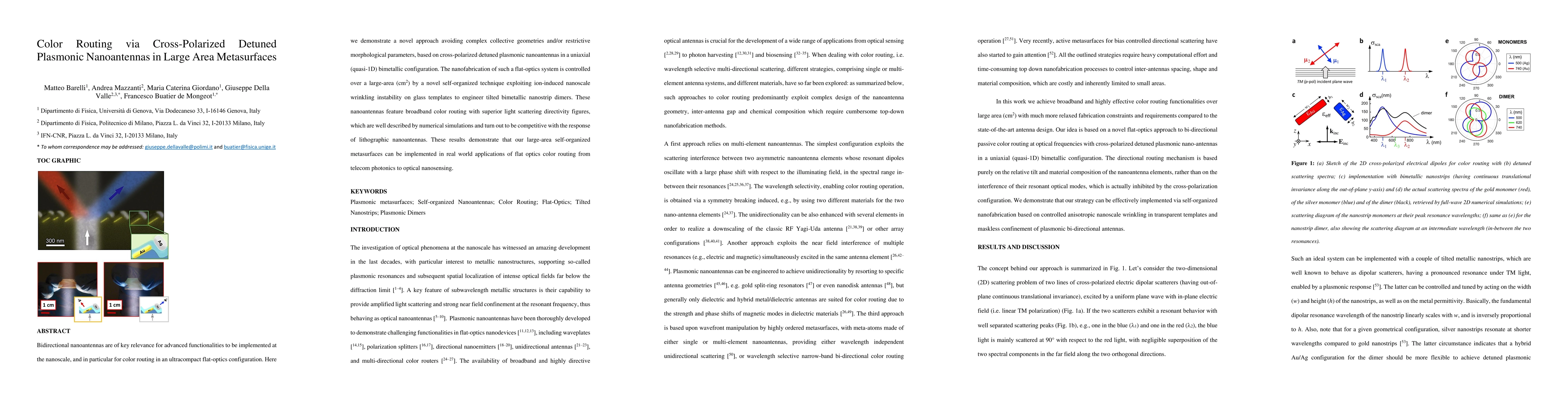 This paper presents a novel method for color routing using cross-polarized detuned plasmonic nanoantennas in large-area metasurfaces, fabricated via a self-organized technique based on ion-induced nanoscale wrinkling. This approach achieves broadband color routing with high directivity, making it competitive for applications in flat optics, from telecom photonics to optical nanosensing.