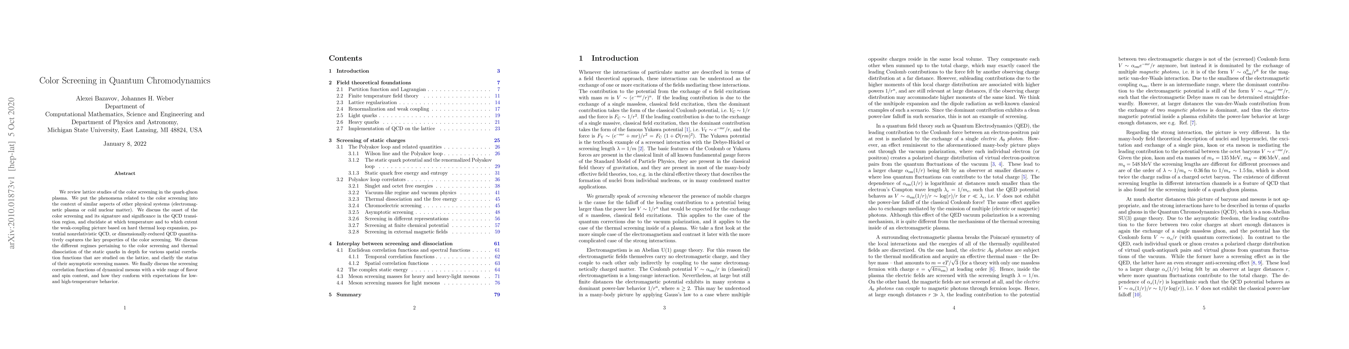 This paper reviews lattice studies on color screening in quark-gluon plasma, comparing it to electromagnetic plasma and cold nuclear matter. It examines the onset and significance of color screening in the QCD transition region, assessing the applicability of weak-coupling theories and discussing various regimes and asymptotic screening masses.
