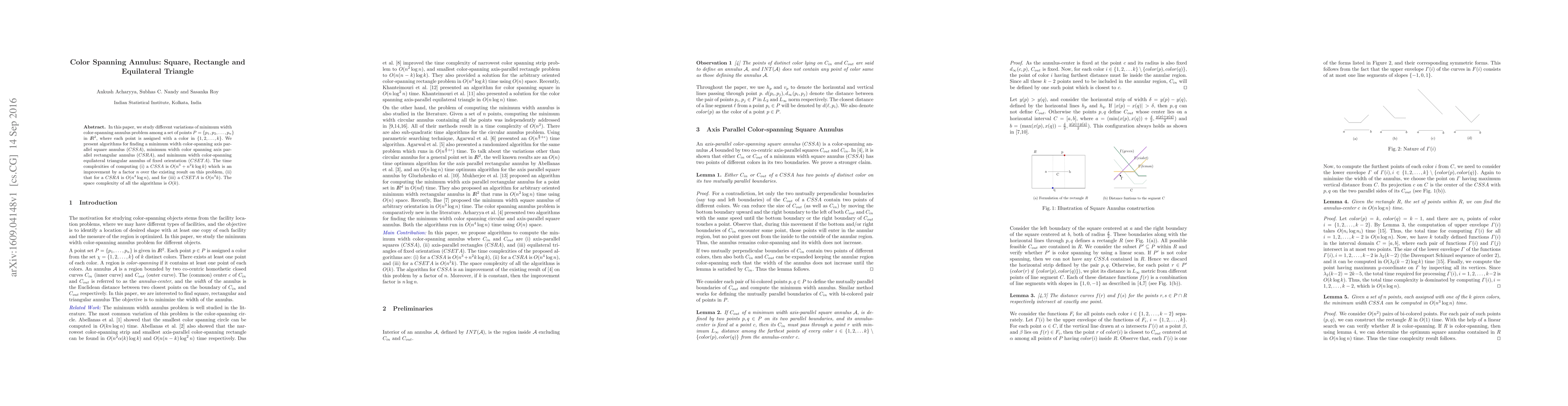 This paper presents algorithms for finding minimum width color-spanning axis-parallel annulus shapes—square, rectangle, and equilateral triangle—among colored points in $I\!\!R^2$. The proposed algorithms have improved time complexities: $O(n^3+n^2k\log k)$ for the square, $O(n^4\log n)$ for the rectangle, and $O(n^3k)$ for the equilateral triangle.